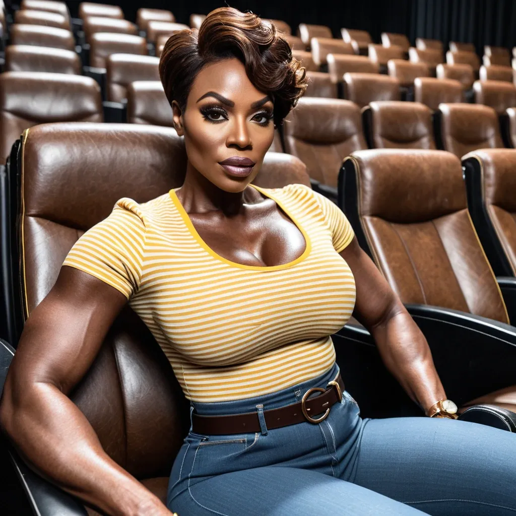 Generate Gorgeous 34 years old , female boss , dark-skinned African-American woman , bimbo , hourglass body , abnormally massive female bodybuilder , gorgeous , close up , full lips , big booty , brown , short pixie hair , feminine silhouette , too big breast , big booty , sexy thighs abs , silhouette , up close , flexing biceps , beautiful brown eyes , legs are iconic and defining physical feature , both visually and in terms of combat ability.wearing an outfit that is a striking blend of elegance , power , and femininity , designed to command attention in any room. The suit is tailored to perfection , hugging the wearer’s curves with precision while emphasizing a structured silhouette. The fabric itself is a refined grey tweed patterned with subtle white grid lines , giving the suit a texture that feels both sophisticated and modern. The blazer features broad blue lapels and gold button accents , adding a luxurious touch that elevates the look beyond typical business attire. The matching high-waisted trousers elongate the frame , further enhancing the poised and commanding effect of the ensemble.The styling choices amplify the boldness of the suit. The inner blouse is a silky , greybutton-down shirt that complements the tweed’s tone while introducing a softer , feminine balance to the sharp tailoring of the jacket. The blouse peeks out neatly from under the blazer , maintaining elegance without drawing focus away from the suit’s commanding cut. Accessories are kept minimal yet intentional: a delicate layered gold necklace and hoop earrings that add glimmers of light and luxury without overpowering the outfit. The choice of voluminous , honey-brown braids cascading down her shoulders frames the face with both confidence and glamour , completing the commanding visual.Altogether , this look communicates a blend of authority and allure. It is business-ready yet fashion-forward , balancing corporate structure with vibrant femininity. The color palette blue , grey and gold avoids being overly delicate , instead embracing the richness of texture , structure , and presence. This is the kind of ensemble that speaks to ambition , sophistication , and personal style—ideal for someone who thrives in positions of influence but insists on expressing her individuality with bold elegance. It’s not just clothing—it’s a statement of power wrapped in grace. In luxury living legs that could crush a watermelon , skirt high boots are a bold and striking statement piece , crafted in glossy black patent leather that gives them a sleek , polished finish. Rising to just below the knee , the boots feature three adjustable buckle straps along the shaft , adding both edge and detail to their design. The towering stiletto heel , paired with a thick platform sole , creates an ultra-dramatic silhouette that elongates the leg and exudes power and confidence. With their combination of shine , height , and structure , these boots perfectly balance fierce femininity with high-fashion allure. High cheekbones , prominent jawline , gorgeous big brown eyes , enormous breast , grey denim pants , yellow and blue horizontal striped v neck t- shirt , skirt , sitting in chair in movie theater , gorgeous brown eyes , enormous butt , enormous breast ,