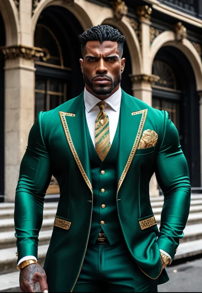 Generate ruggedly handsome dark-skinned African-American man abnormally massive male bodybuilder , , close up , full lips , big booty , black trimmed coarse hair , big , muscular man , brown strikingly intense and alluring eyes , up close , flexing biceps , beautiful brown eyes , legs are iconic and defining physical feature , both visually and in terms of combat ability.wearing an outfit that is a striking blend of elegance , power , and femininity , designed to command attention in any room. The suit is tailored to perfection , hugging the wearer’s curves with precision while emphasizing a structured silhouette. The fabric itself is a refined grey tweed patterned with subtle white grid lines , giving the suit a texture that feels both sophisticated and modern. The blazer features broad blue lapels and gold button accents , adding a luxurious touch that elevates the look beyond typical business attire. The matching high-waisted trousers elongate the frame , further enhancing the poised and commanding effect of the ensemble.The styling choices amplify the boldness of the suit. The inner shirt is a silky , greybutton-down shirt that complements the tweed’s tone while introducing a masculine balance to the sharp tailoring of the jacket. The shirt peeks out neatly from under the blazer , maintaining elegance without drawing focus away from the suit’s commanding cut. Accessories are kept minimal yet intentional: a delicate layered gold necklace ad alpha leader of light and luxury without overpowering the outfit completing the commanding visual.Altogether , this look communicates a blend of authority and allure. It is business-ready yet fashion-forward , balancing corporate structure with vibrant femininity. The color palette blue , grey and gold avoids being overly delicate , instead embracing the richness of texture , structure , and presence. This is the kind of ensemble that speaks to ambition , sophistication , and personal style—ideal for someone who thrives in positions of influence but insists on expressing her individuality with bold elegance. It’s not just clothing—it’s a statement of power wrapped in grace. In luxury living legs that could crush a watermelon , skirt high boots are a bold and striking statement piece , crafted in glossy black patent leather that gives them a sleek , polished finish. Rising to just below the knee , the boots feature three adjustable buckle straps along the shaft , adding both edge and detail to their design. The towering stiletto heel , paired with a thick platform sole , creates an ultra-dramatic silhouette that elongates the leg and exudes power and confidence. With their combination of shine , height , and structure , these boots perfectly balance fierce femininity with high-fashion allure , The man’s outfit radiates power , precision , and luxury—an impeccable fusion of old-world tailoring and modern dominance. He wears a deep emerald-green dress shirt , its satin texture catching the light with subtle brilliance. The shirt’s fit is sculpted to his muscular frame , sleeves rolled tightly to reveal tattooed forearms that suggest strength beneath sophistication. The color choice—green—evokes wealth , strategy , and danger , setting a commanding tone that feels both aristocratic and ruthless. Over the shirt , he dons a fitted waistcoat striped in gold and forest green , accented with ornate baroque embroidery that gleams like filigree. The metallic embroidery runs along the vest’s center , curling into intricate motifs that merge Victorian elegance with Dream City’s futuristic opulence. Each button and seam feels custom-forged , reflecting craftsmanship reserved for those of status and influence. The gold tie at his collar complements the vest perfectly , glowing like a thread of authority that ties his entire look together. Completing the ensemble are matching trousers that continue the gold-striped pattern , cinched by a sleek black belt with a polished buckle. Black leather gloves sheath his hands , adding an element of menace beneath refinement—hinting he’s as ready for confrontation as he is for conversation. His beanie adds a contemporary twist , softening the formality with streetwise undertone. Altogether , the outfit captures a balance between elegance and intimidation—a portrait of a Dream City power broker who dresses like royalty but fights like a soldier. ,
