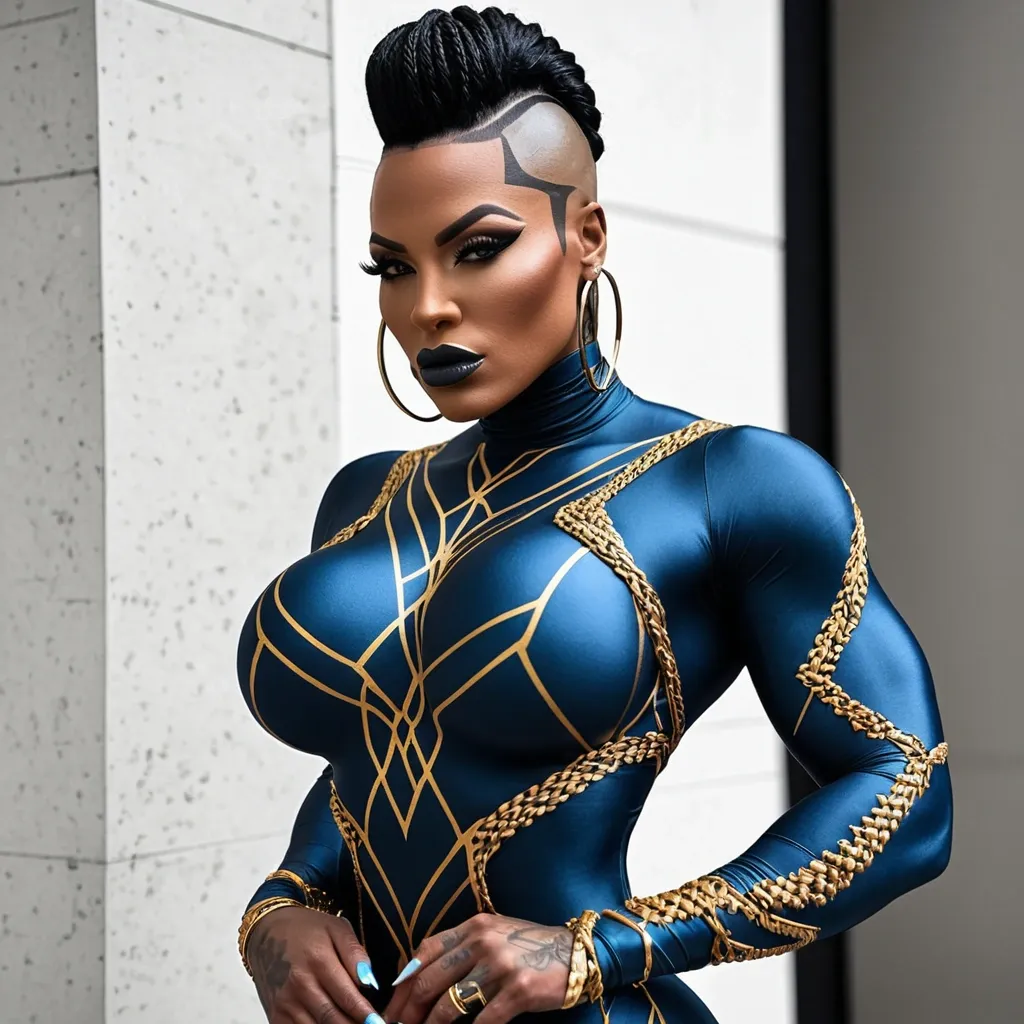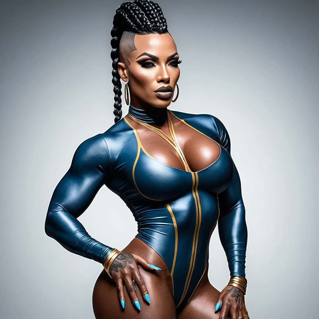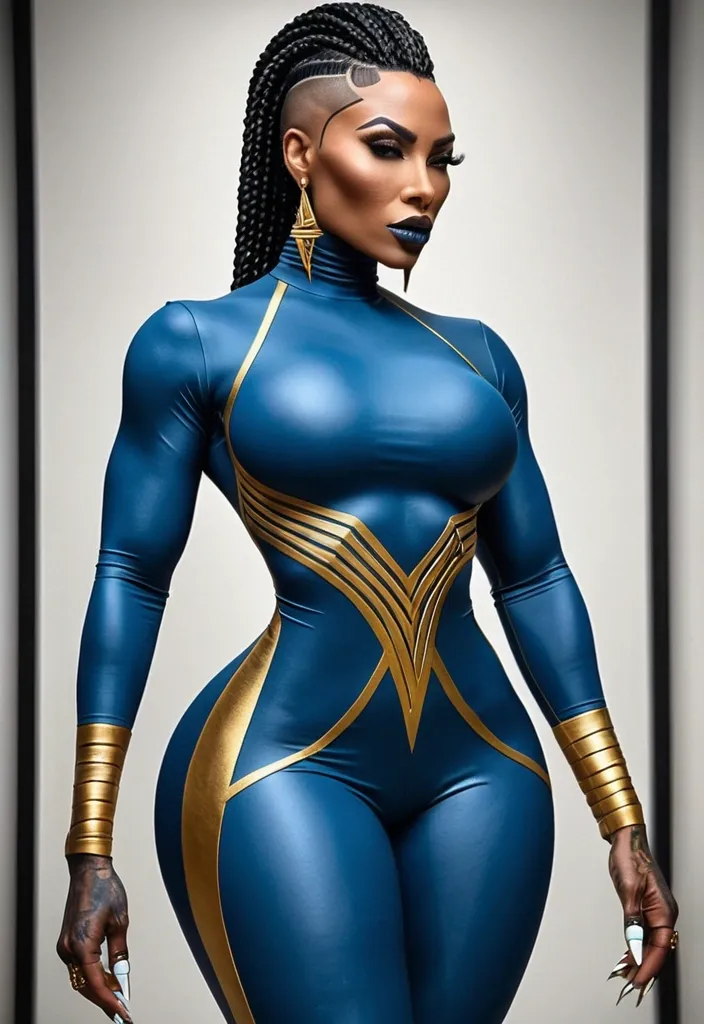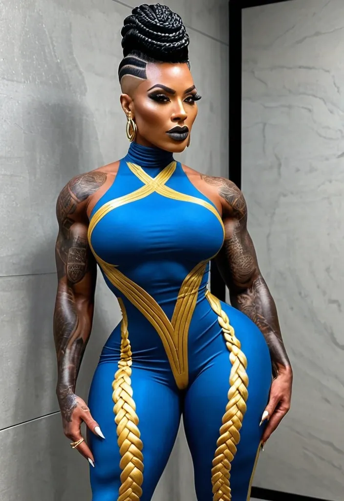 Generate Gorgeous female boss , bimbo , hourglass body , dark-skinned African-American , pointy face , abnormally massive female bodybuilder , gorgeous , close up , full lips , big booty , black hair , braided design mohawk , bald on the side , feminine silhouette , too big breast , big booty , sexy thighs abs , silhouette , up close , flexing biceps , gorgeous hazel eyes , legs are iconic and defining physical feature , both visually and in terms of combat ability.wearing an outfit that is a striking blend of elegance , power , and femininity , designed to command attention in any room. The suit is tailored to perfection , hugging the wearer’s curves with precision while emphasizing a structured silhouette. The fabric itself is a refined grey tweed patterned with subtle white grid lines , giving the suit a texture that feels both sophisticated and modern. The blazer features broad blue lapels and gold button accents , adding a luxurious touch that elevates the look beyond typical business attire. The matching high-waisted trousers elongate the frame , further enhancing the poised and commanding effect of the ensemble.The styling choices amplify the boldness of the suit. The inner blouse is a silky , greybutton-down shirt that complements the tweed’s tone while introducing a softer , feminine balance to the sharp tailoring of the jacket. The blouse peeks out neatly from under the blazer , maintaining elegance without drawing focus away from the suit’s commanding cut. Accessories are kept minimal yet intentional: a delicate layered gold necklace and hoop earrings that add glimmers of light and luxury without overpowering the outfit. The choice of voluminous , honey-brown braids cascading down her shoulders frames the face with both confidence and glamour , completing the commanding visual.Altogether , this look communicates a blend of authority and allure. It is business-ready yet fashion-forward , balancing corporate structure with vibrant femininity. The color palette blue , grey and gold avoids being overly delicate , instead embracing the richness of texture , structure , and presence. This is the kind of ensemble that speaks to ambition , sophistication , and personal style—ideal for someone who thrives in positions of influence but insists on expressing her individuality with bold elegance. It’s not just clothing—it’s a statement of power wrapped in grace. Stacked hourglass silhouette , t-shirt ,