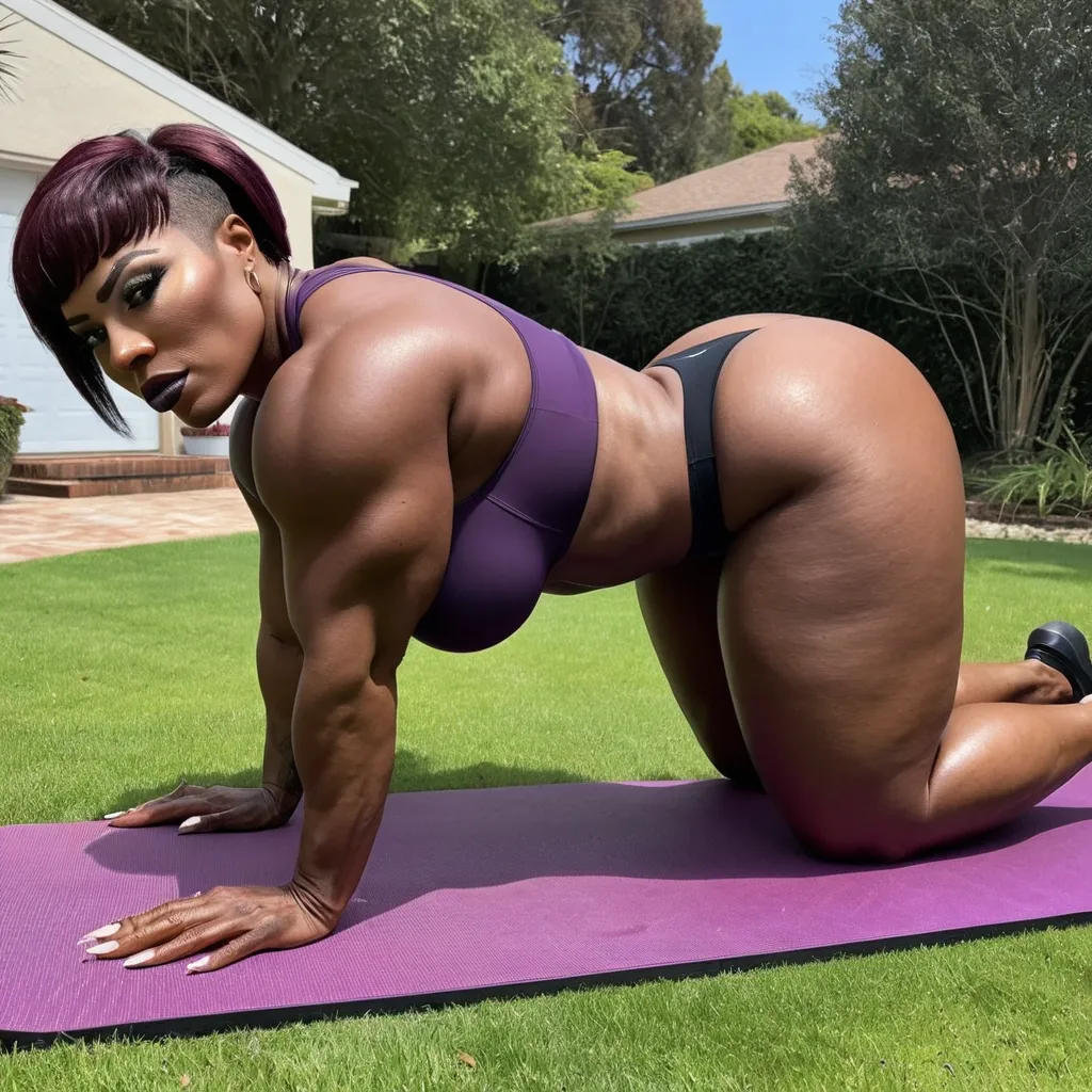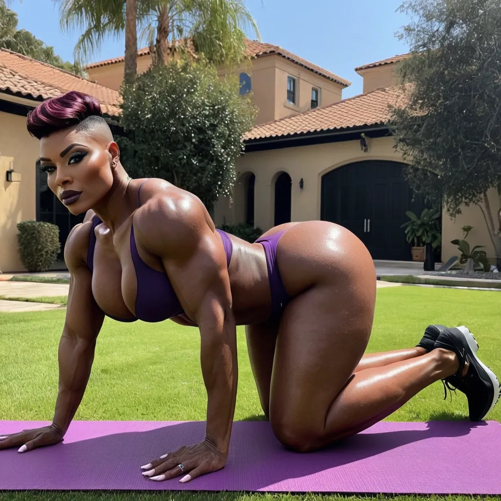 Generate Gorgeous 37 years old , female boss , dark-skinned African-American woman , bimbo , hourglass body , abnormally massive female bodybuilder , gorgeous , close up , full lips , big booty , brown hair , short pixie hair , shaved on the side , bangs , feminine silhouette , too big breast , big booty , sexy thighs abs , silhouette , up close , flexing biceps , beautiful brown eyes , legs are iconic and defining physical feature , both visually and in terms of combat ability.wearing an outfit that is a striking blend of elegance , power , and femininity , designed to command attention in any room. The suit is tailored to perfection , hugging the wearer’s curves with precision while emphasizing a structured silhouette. The fabric itself is a refined grey tweed patterned with subtle white grid lines , giving the suit a texture that feels both sophisticated and modern. The blazer features broad blue lapels and gold button accents , adding a luxurious touch that elevates the look beyond typical business attire. The matching high-waisted trousers elongate the frame , further enhancing the poised and commanding effect of the ensemble.The styling choices amplify the boldness of the suit. The inner blouse is a silky , greybutton-down shirt that complements the tweed’s tone while introducing a softer , feminine balance to the sharp tailoring of the jacket. The blouse peeks out neatly from under the blazer , maintaining elegance without drawing focus away from the suit’s commanding cut. Accessories are kept minimal yet intentional: a delicate layered gold necklace and hoop earrings that add glimmers of light and luxury without overpowering the outfit. The choice of voluminous , honey-brown braids cascading down her shoulders frames the face with both confidence and glamour , completing the commanding visual.Altogether , this look communicates a blend of authority and allure. It is business-ready yet fashion-forward , balancing corporate structure with vibrant femininity. The color palette blue , grey and gold avoids being overly delicate , instead embracing the richness of texture , structure , and presence. This is the kind of ensemble that speaks to ambition , sophistication , and personal style—ideal for someone who thrives in positions of influence but insists on expressing her individuality with bold elegance. It’s not just clothing—it’s a statement of power wrapped in grace. In luxury living legs that could crush a watermelon , skirt high boots are a bold and striking statement piece , crafted in glossy black patent leather that gives them a sleek , polished finish. Rising to just below the knee , the boots feature three adjustable buckle straps along the shaft , adding both edge and detail to their design. The towering stiletto heel , paired with a thick platform sole , creates an ultra-dramatic silhouette that elongates the leg and exudes power and confidence. With their combination of shine , height , and structure , these boots perfectly balance fierce femininity with high-fashion allure. High cheekbones , prominent jawline , gorgeous big brown eyes , freckles , enormous breast , black and purple sports bra , and black thong , front yard gorgeous brown eyes , enormous breast , enormous butt , stacked hourglass silhouette , enormous breast , enormous butt , on all fours , arched back on yoga mat , profile shot , on all fours , enormous butt ,