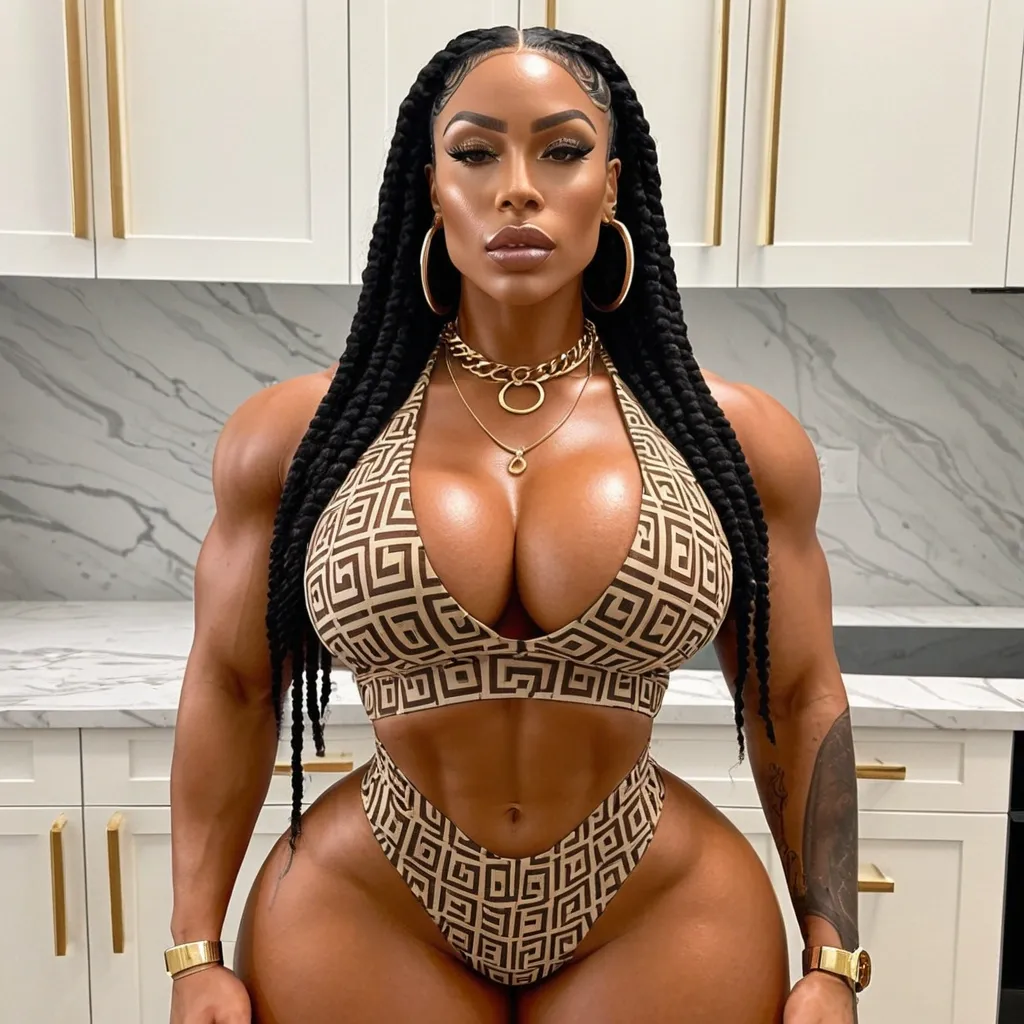 24 years old , Light-skinned African-American woman — extremely beautiful , with a presence that feels quietly dangerous and quietly royal at the same time. She has that soft glow in her skin that looks effortless , like she wakes up looking like this every day without trying , but everyone knows she still probably puts in discipline the old fashioned way. Her bone structure is model tier… cheekbones that could cut through pride , a jawline that says she doesn’t bend for just anybody , and soft lips that hold mystery and restraint all at once.Her short locs is cropped close , styled in textured waves that shape her face like an artist’s finishing brush stroke. It gives her a striking , modern elegance — feminine , but with that slight edge that tells you she’s not the type anyone ever controls. Her eyebrows are naturally bold and shaped sharply , framing her hazel eyes that practically glow with their own weather system. Those eyes… you could lose a fight in those eyes before she ever speaks a word.She has luminous , glossy skin that reflects light like polished bronze catching early morning sun. Natural freckles sprinkle just lightly across her cheeks , softening the intimidation factor with a hint of youthful innocence. The way the light hits her face makes her look sculpted — like an ultra realistic painting brought to life. Everything about her looks intentional… but also like she was born this way.There’s also this quiet calm in her expression — not emotional weakness — but a poised , unshakeable stillness that only comes from knowing exactly who you are and not needing to defend it. She looks like the woman who never rushes into noise… she waits , she observes , she lets the room shift around her while she remains unmoved. That alone is power — and she wears it naturally like an old soul who understands her worth in ways other people are still scrambling to figure out , blonde short short dreadlocks hair , muscular body builder woman , abnormally massive woman , enormous breast , enormous buttThe low-cut top emphasizes her posture , drawing attention to her chest as she gazes directly ahead. Squeezing her breast together , standing in kitchen , enormous butt , , Enormous breast , facing camera , She’s wearing a tan Gucci patterned sleeveless top that fits snug and shows off her curves boldly. She also has a gold name necklace that reads “Chuma , ” paired with large gold hoop earrings that give her that confident , flashy , fashion-first vibe. ,