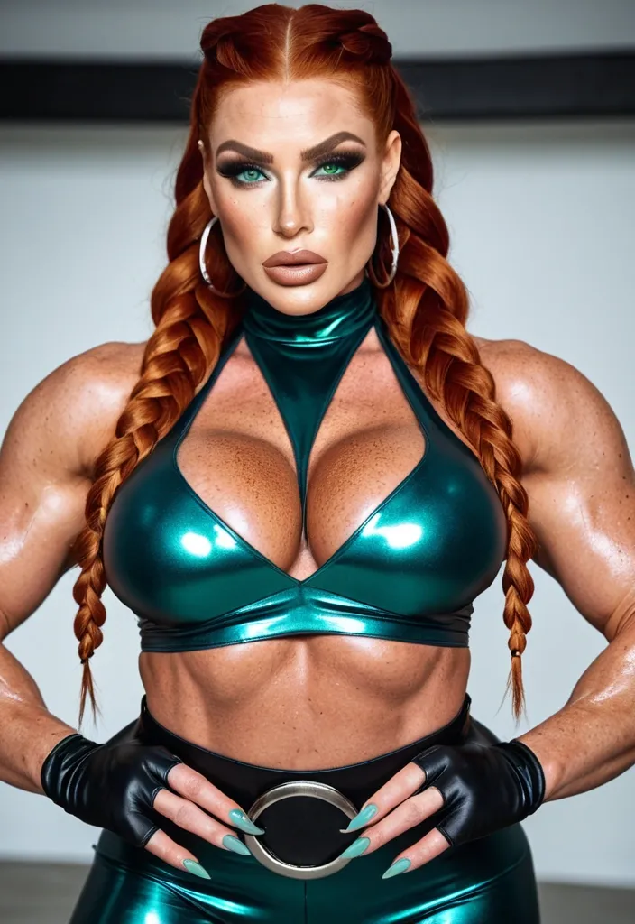 Generate Gorgeous female boss , bimbo , hourglass body , abnormally massive female bodybuilder , gorgeous , close up , full lips , big booty , redhead , freckles on face and breast , braided design hair , feminine silhouette , too big breast , big booty , sexy thighs abs , silhouette , up close , flexing biceps , beautiful green eyes , legs are iconic and defining physical feature , both visually and in terms of combat ability.wearing an outfit that is a striking blend of elegance , power , and femininity , designed to command attention in any room. The suit is tailored to perfection , hugging the wearer’s curves with precision while emphasizing a structured silhouette. The fabric itself is a refined grey tweed patterned with subtle white grid lines , giving the suit a texture that feels both sophisticated and modern. The blazer features broad blue lapels and gold button accents , adding a luxurious touch that elevates the look beyond typical business attire. The matching high-waisted trousers elongate the frame , further enhancing the poised and commanding effect of the ensemble.The styling choices amplify the boldness of the suit. The inner blouse is a silky , greybutton-down shirt that complements the tweed’s tone while introducing a softer , feminine balance to the sharp tailoring of the jacket. The blouse peeks out neatly from under the blazer , maintaining elegance without drawing focus away from the suit’s commanding cut. Accessories are kept minimal yet intentional: a delicate layered gold necklace and hoop earrings that add glimmers of light and luxury without overpowering the outfit. The choice of voluminous , honey-brown braids cascading down her shoulders frames the face with both confidence and glamour , completing the commanding visual.Altogether , this look communicates a blend of authority and allure. It is business-ready yet fashion-forward , balancing corporate structure with vibrant femininity. The color palette blue , grey and gold avoids being overly delicate , instead embracing the richness of texture , structure , and presence. This is the kind of ensemble that speaks to ambition , sophistication , and personal style—ideal for someone who thrives in positions of influence but insists on expressing her individuality with bold elegance. It’s not just clothing—it’s a statement of power wrapped in grace. In luxury living legs that could crush a watermelon , skirt high boots are a bold and striking statement piece , crafted in glossy black patent leather that gives them a sleek , polished finish. Rising to just below the knee , the boots feature three adjustable buckle straps along the shaft , adding both edge and detail to their design. The towering stiletto heel , paired with a thick platform sole , creates an ultra-dramatic silhouette that elongates the leg and exudes power and confidence. With their combination of shine , height , and structure , these boots perfectly balance fierce femininity with high-fashion allure. High cheekbones , prominent jawline , gorgeous big green eyes , freckles , enormous breast , She wears a glossy , metallic-blue halter-style crop closed top with a deep circular cutout that frames her cleavage , connected by a small central ring , paired with high-waisted , form-fitting charcoal pants cinched by an oversized silver belt buckle , black fingerless gloves , a metallic choker , and a silver V-shaped . ,