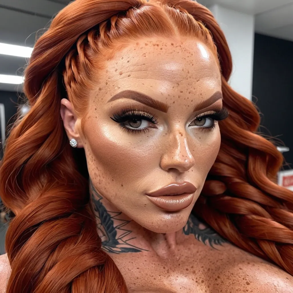 Generate Gorgeous female boss , bimbo , hourglass body , abnormally massive female bodybuilder , gorgeous , close up , full lips , big booty , redheaded , freckles on face and breast , braided design hair , feminine silhouette , too big breast , big booty , sexy thighs abs , silhouette , up close , flexing biceps , beautiful green eyes , legs are iconic and defining physical feature , both visually and in terms of combat ability.wearing an outfit that is a striking blend of elegance , power , and femininity , designed to command attention in any room. The suit is tailored to perfection , hugging the wearer’s curves with precision while emphasizing a structured silhouette. The fabric itself is a refined grey tweed patterned with subtle white grid lines , giving the suit a texture that feels both sophisticated and modern. The blazer features broad blue lapels and gold button accents , adding a luxurious touch that elevates the look beyond typical business attire. The matching high-waisted trousers elongate the frame , further enhancing the poised and commanding effect of the ensemble.The styling choices amplify the boldness of the suit. The inner blouse is a silky , greybutton-down shirt that complements the tweed’s tone while introducing a softer , feminine balance to the sharp tailoring of the jacket. The blouse peeks out neatly from under the blazer , maintaining elegance without drawing focus away from the suit’s commanding cut. Accessories are kept minimal yet intentional: a delicate layered gold necklace and hoop earrings that add glimmers of light and luxury without overpowering the outfit. The choice of voluminous , honey-brown braids cascading down her shoulders frames the face with both confidence and glamour , completing the commanding visual.Altogether , this look communicates a blend of authority and allure. It is business-ready yet fashion-forward , balancing corporate structure with vibrant femininity. The color palette blue , grey and gold avoids being overly delicate , instead embracing the richness of texture , structure , and presence. This is the kind of ensemble that speaks to ambition , sophistication , and personal style—ideal for someone who thrives in positions of influence but insists on expressing her individuality with bold elegance. It’s not just clothing—it’s a statement of power wrapped in grace. In luxury living legs that could crush a watermelon , skirt high boots are a bold and striking statement piece , crafted in glossy black patent leather that gives them a sleek , polished finish. Rising to just below the knee , the boots feature three adjustable buckle straps along the shaft , adding both edge and detail to their design. The towering stiletto heel , paired with a thick platform sole , creates an ultra-dramatic silhouette that elongates the leg and exudes power and confidence. With their combination of shine , height , and structure , these boots perfectly balance fierce femininity with high-fashion allure. ,