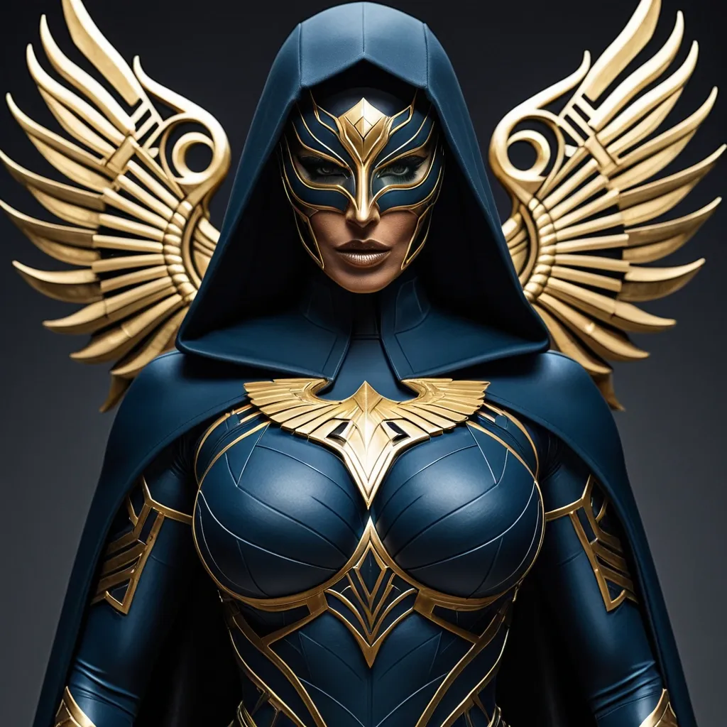 Generate Gorgeous female boss , latina , bimbo , hourglass body , abnormally massive female bodybuilder , gorgeous , close up , full lips , big booty , black hair , freckles on face and breast , black stylish hair , feminine silhouette , too big breast , big booty , sexy thighs abs , silhouette , up close , flexing biceps , beautiful green eyes , legs are iconic and defining physical feature , both visually and in terms of combat ability.wearing an outfit that is a striking blend of elegance , power , and femininity , designed to command attention in any room. The suit is tailored to perfection , hugging the wearer’s curves with precision while emphasizing a structured silhouette. The fabric itself is a refined grey tweed patterned with subtle white grid lines , giving the suit a texture that feels both sophisticated and modern. The blazer features broad blue lapels and gold button accents , adding a luxurious touch that elevates the look beyond typical business attire. The matching high-waisted trousers elongate the frame , further enhancing the poised and commanding effect of the ensemble.The styling choices amplify the boldness of the suit. The inner blouse is a silky , greybutton-down shirt that complements the tweed’s tone while introducing a softer , feminine balance to the sharp tailoring of the jacket. The blouse peeks out neatly from under the blazer , maintaining elegance without drawing focus away from the suit’s commanding cut. Accessories are kept minimal yet intentional: a delicate layered gold necklace and hoop earrings that add glimmers of light and luxury without overpowering the outfit. The choice of voluminous , honey-brown braids cascading down her shoulders frames the face with both confidence and glamour , completing the commanding visual.Altogether , this look communicates a blend of authority and allure. It is business-ready yet fashion-forward , balancing corporate structure with vibrant femininity. The color palette blue , grey and gold avoids being overly delicate , instead embracing the richness of texture , structure , and presence. This is the kind of ensemble that speaks to ambition , sophistication , and personal style—ideal for someone who thrives in positions of influence but insists on expressing her individuality with bold elegance. It’s not just clothing—it’s a statement of power wrapped in grace. In luxury living legs that could crush a watermelon , skirt high boots are a bold and striking statement piece , crafted in glossy black patent leather that gives them a sleek , polished finish. Rising to just below the knee , the boots feature three adjustable buckle straps along the shaft , adding both edge and detail to their design. The towering stiletto heel , paired with a thick platform sole , creates an ultra-dramatic silhouette that elongates the leg and exudes power and confidence. With their combination of shine , height , and structure , these boots perfectly balance fierce femininity with high-fashion allure. High cheekbones , prominent jawline , gorgeous big green eyes , The suit is tailored to perfection , hugging the wearer’s curves with precision while emphasizing a structured silhouette. The fabric itself is a refined hood is a sleek , shadowed piece of her attire that falls close around her head and face , designed to enhance her aura of mystery and command. It is constructed from a matte black material that absorbs the light rather than reflecting it , giving her an ominous , almost spectral presence. The hood frames her face sharply and extends back into her cape , making her silhouette formidable and cohesive in its dark elegance. Its cut and fit are tailored to stay close to her head , preventing it from obstructing her vision while still cloaking her in an air of secrecy.Her mask is sharp , angular , and striking in its design. Black in color and sculpted to fit tightly against her face , it covers the area around her eyes with precision. Its edges sweep into bold curves that sharpen her gaze , emphasizing her piercing eyes and amplifying the intensity of her expression. The mask isn’t just a disguise—it acts as a symbol of her commitment , projecting authority and determination. With its seamless integration into her look , the mask gives her a sense of duality: a woman hidden yet revealed , a protector whose eyes burn with resolve.The superhero top is a masterpiece of tactical artistry and symbolism. Made from high-grade , form-fitted navy blue material that molds seamlessly to her muscular frame , it balances power with elegance. Across her chest spreads the golden emblem of a soaring eagle—wings outstretched , poised in eternal flight—representing her vow to uphold justice and truth. Gold lines accentuate her physique , converging in a V-shaped pattern that not only reinforces her strength but also adds a regal , almost ceremonial presence. This design makes her top both armor and declaration , a visual oath in itself. embracing the richness of texture , structure , and presence. This is the kind of ensemble that speaks to ambition , sophistication , and personal style—ideal for someone who thrives in positions of influence but insists on expressing her individuality with bold elegance. It’s not just clothing—it’s a statement of power wrapped in grace. Half mask , exposing hair , exposing mouth golden eagle emblem on chest. Cape , full hody shot ,