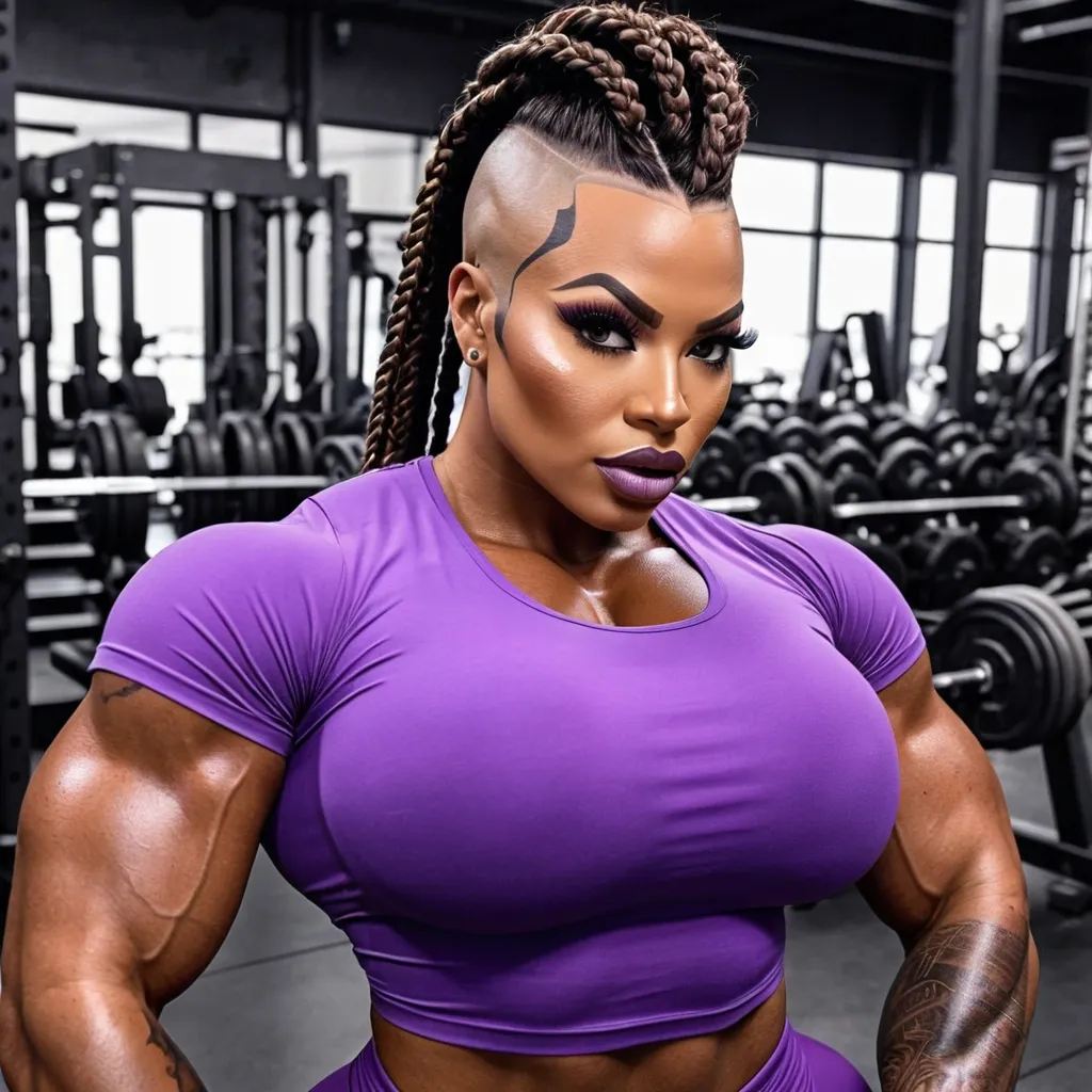 Generate Gorgeous 24 years old , female boss , dark-skinned African-American woman , bimbo , hourglass body , abnormally massive female bodybuilder , gorgeous , close up , full lips , big booty , brown , braided styled mohawk and bald on the side feminine silhouette , too big breast , big booty , sexy thighs abs , silhouette , up close , flexing biceps , beautiful honey hazel eyes eyes , legs are iconic and defining physical feature , both visually and in terms of combat ability.wearing an outfit that is a striking blend of elegance , power , and femininity , designed to command attention in any room. The suit is tailored to perfection , hugging the wearer’s curves with precision while emphasizing a structured silhouette. The fabric itself is a refined grey tweed patterned with subtle white grid lines , giving the suit a texture that feels both sophisticated and modern. The blazer features broad blue lapels and gold button accents , adding a luxurious touch that elevates the look beyond typical business attire. The matching high-waisted trousers elongate the frame , further enhancing the poised and commanding effect of the ensemble.The styling choices amplify the boldness of the suit. The inner blouse is a silky , greybutton-down shirt that complements the tweed’s tone while introducing a softer , feminine balance to the sharp tailoring of the jacket. The blouse peeks out neatly from under the blazer , maintaining elegance without drawing focus away from the suit’s commanding cut. Accessories are kept minimal yet intentional: a delicate layered gold necklace and hoop earrings that add glimmers of light and luxury without overpowering the outfit. The choice of voluminous , honey-brown braids cascading down her shoulders frames the face with both confidence and glamour , completing the commanding visual.Altogether , this look communicates a blend of authority and allure. It is business-ready yet fashion-forward , balancing corporate structure with vibrant femininity. The color palette blue , grey and gold avoids being overly delicate , instead embracing the richness of texture , structure , and presence. This is the kind of ensemble that speaks to ambition , sophistication , and personal style—ideal for someone who thrives in positions of influence but insists on expressing her individuality with bold elegance. It’s not just clothing—it’s a statement of power wrapped in grace. In luxury living legs that could crush a watermelon , skirt high boots are a bold and striking statement piece , crafted in glossy black patent leather that gives them a sleek , polished finish. Rising to just below the knee , the boots feature three adjustable buckle straps along the shaft , adding both edge and detail to their design. The towering stiletto heel , paired with a thick platform sole , creates an ultra-dramatic silhouette that elongates the leg and exudes power and confidence. With their combination of shine , height , and structure , these boots perfectly balance fierce femininity with high-fashion allure. High cheekbones , prominent jawline , gorgeous honey hazel n eyes , freckles , enormous breast , violet t-shirt , violet pants in gym ,