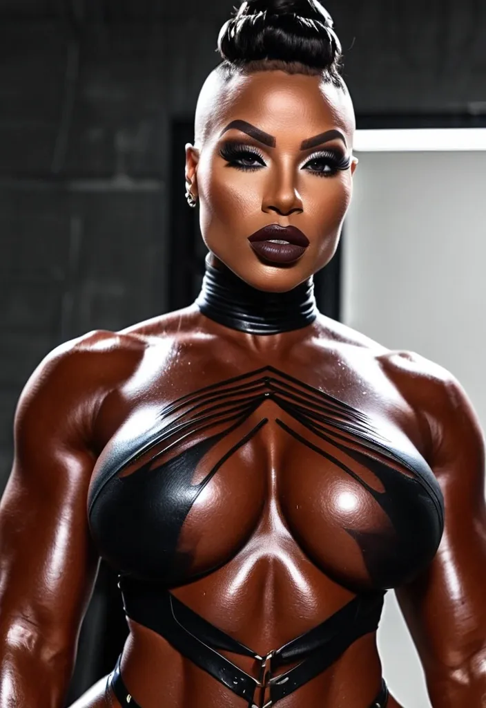 Generate Gorgeous 24 years old , female boss , dark-skinned African-American woman , Adrienne-Joy Johnson face , bimbo , hourglass body , abnormally massive female bodybuilder , gorgeous , close up , full lips , big booty , brown , braided styled mohawk and bald on the side feminine silhouette , too big breast , big booty , sexy thighs abs , silhouette , up close , flexing biceps , beautiful honey hazel eyes eyes , legs are iconic and defining physical feature , both visually and in terms of combat ability.wearing an outfit that is a striking blend of elegance , power , and femininity , designed to command attention in any room. The suit is tailored to perfection , hugging the wearer’s curves with precision while emphasizing a structured silhouette. The fabric itself is a refined grey tweed patterned with subtle white grid lines , giving the suit a texture that feels both sophisticated and modern. The blazer features broad blue lapels and gold button accents , adding a luxurious touch that elevates the look beyond typical business attire. The matching high-waisted trousers elongate the frame , further enhancing the poised and commanding effect of the ensemble.The styling choices amplify the boldness of the suit. The inner blouse is a silky , greybutton-down shirt that complements the tweed’s tone while introducing a softer , feminine balance to the sharp tailoring of the jacket. The blouse peeks out neatly from under the blazer , maintaining elegance without drawing focus away from the suit’s commanding cut. Accessories are kept minimal yet intentional: a delicate layered gold necklace and hoop earrings that add glimmers of light and luxury without overpowering the outfit. The choice of voluminous , honey-brown braids cascading down her shoulders frames the face with both confidence and glamour , completing the commanding visual.Altogether , this look communicates a blend of authority and allure. It is business-ready yet fashion-forward , balancing corporate structure with vibrant femininity. The color palette blue , grey and gold avoids being overly delicate , instead embracing the richness of texture , structure , and presence. This is the kind of ensemble that speaks to ambition , sophistication , and personal style—ideal for someone who thrives in positions of influence but insists on expressing her individuality with bold elegance. It’s not just clothing—it’s a statement of power wrapped in grace. In luxury living legs that could crush a watermelon , skirt high boots are a bold and striking statement piece , crafted in glossy black patent leather that gives them a sleek , polished finish. Rising to just below the knee , the boots feature three adjustable buckle straps along the shaft , adding both edge and detail to their design. The towering stiletto heel , paired with a thick platform sole , creates an ultra-dramatic silhouette that elongates the leg and exudes power and confidence. With their combination of shine , height , and structure , these boots perfectly balance fierce femininity with high-fashion allure. High cheekbones , prominent jawline , gorgeous honey hazel n eyes , freckles , enormous breast , black half mask , black and redwine body paint ,