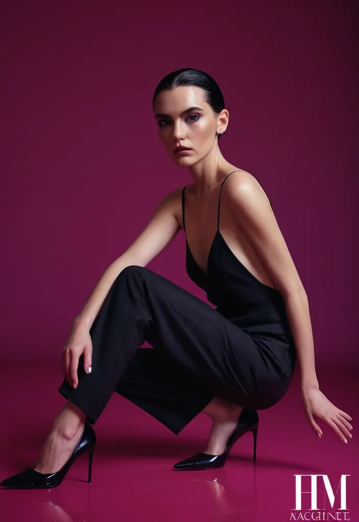 Full-body editorial fashion photography of a sophisticated woman crouching in a graceful , architectural pose. She is wearing a minimalist , sleek black jumpsuit with wide-leg trousers and thin spaghetti straps , paired with classic black pointed-toe stiletto heels. Her hair is styled in a 'wet look' slicked-back bob , and her makeup is dewy and natural with a soft mauve lip. She is resting her chin on her crossed forearms , looking directly at the camera with a calm , intense expression. The background is a solid , vibrant magenta-red matte studio backdrop. The lighting is high-contrast fashion lighting , creating sharp highlights on her skin and deep shadows that define the silhouette. Shot on 85mm lens , 8k resolution , cinematic color grading , high-end magazine aesthetic." ,