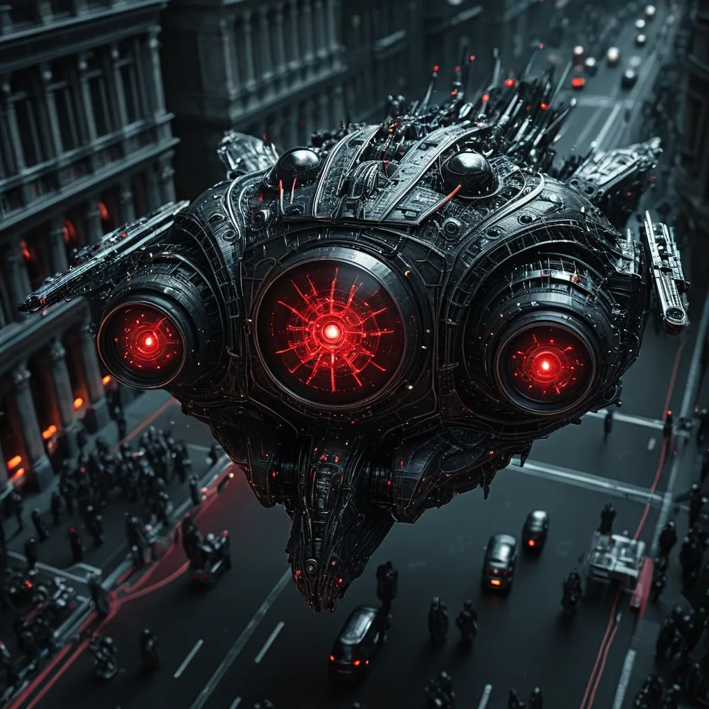 Bird eye view , Renaissance style , black-print of a (surreal spacecraft melting from florescence red eyes in the circuit-wings) , 4k resolution , intricate , wire-frame , masterpiece , trending on art-station , city street black background. Shot in realistic live-action cinematography style. High dynamic range lighting , cinematic color grading , subtle film grain. Natural optical depth of field , realistic lens blur , slight handheld camera micro-movement. 50mm cinematic lens , f/4 aperture , physically accurate lighting , volumetric light diffusion. 8K level visual fidelity , highly detailed environment , believable scale and realistic crowd simulation. The scene feels like a frame from a large-budget live-action science-fiction space movie. ,
