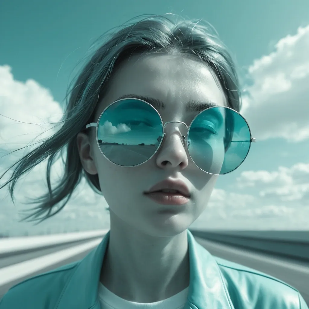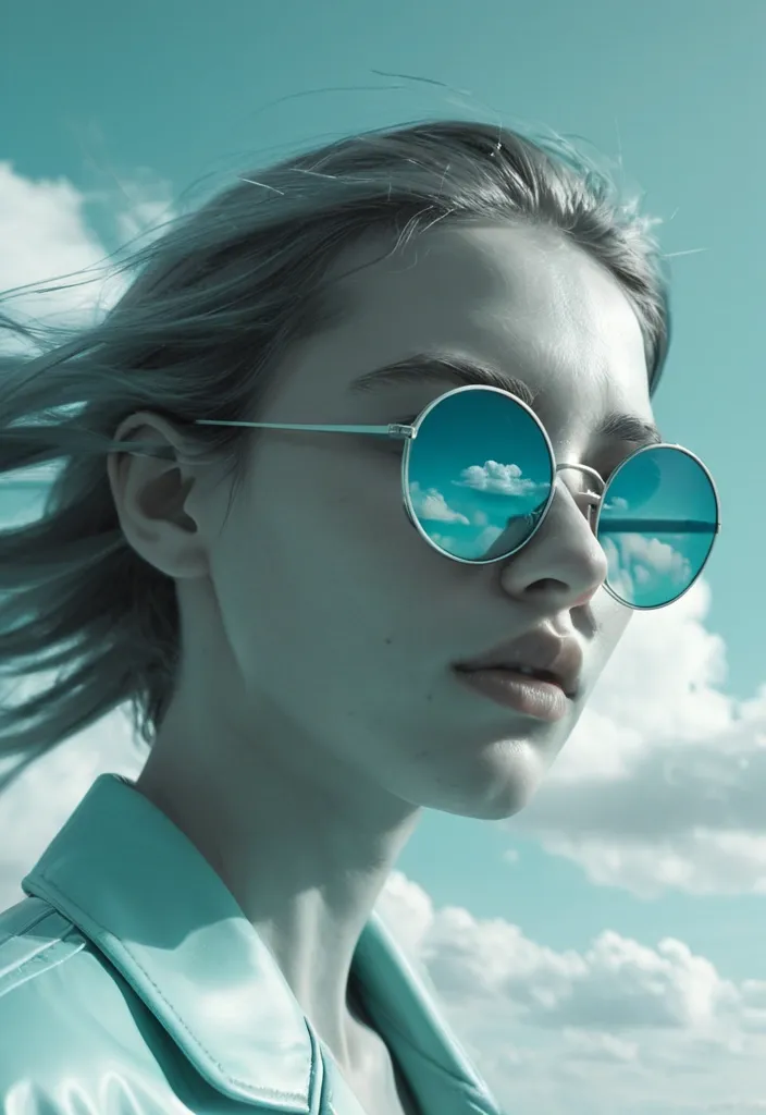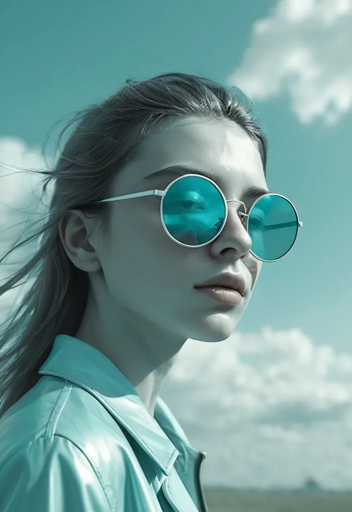 A surreal , photorealistic portrait of a person wearing round reflective sunglasses , set against a softly clouded sky. The image has a motion-blur effect that sweeps horizontally across one side of the face , creating a sense of speed , transition , or digital distortion. The color palette is monochromatic teal or cyan , giving the image a cool , cinematic tone. The subject’s expression is calm and introspective , with subtle highlights on the lips , skin , and glasses. Their hair moves slightly in the breeze , adding texture and realism. The overall composition feels dreamlike and modern , balancing clarity and blur for an artistic , futuristic atmosphere. ar-9:16 ,