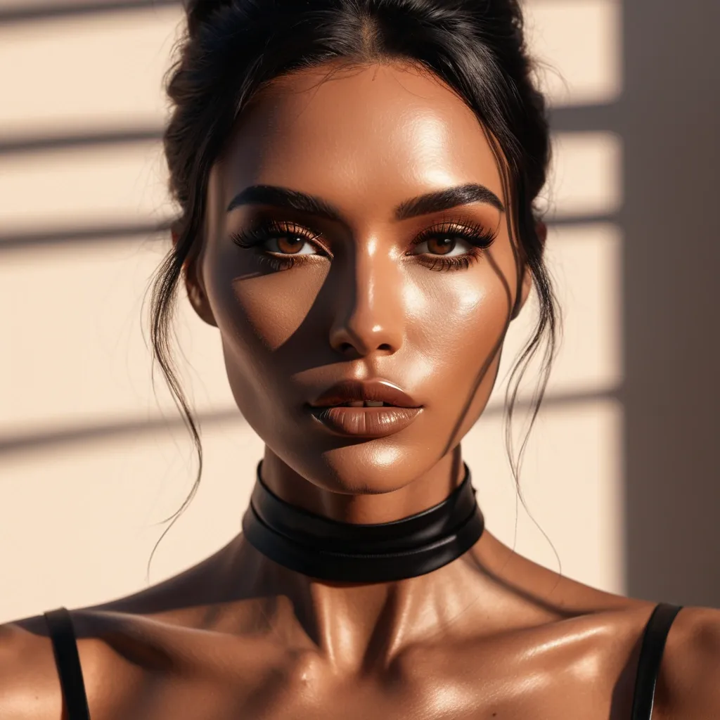 Retrato ultrarrealista de una joven seductora , de entre 18 y 20 años , con cabello largo y sedoso , rubio platinado con puntas rosas , vestida con una blusa blanca transparente con delicados bordados florales azules , ligeramente abierta para revelar un escote pronunciado , piel suave y luminosa , mirada seductora y segura , labios entreabiertos , profundidad de campo cinematográfica , bokeh cremoso. Cómo accesorio una fina gargantilla color negro. ojos marrones cristalinos , sombras suaves que acentúan la silueta femenina , paleta de colores cálidos y naturales , fotografía sensual de alta costura , texturas realistas y ultradetalladas en 8k. --ar 2:3 --v 6 --q 2 ,
