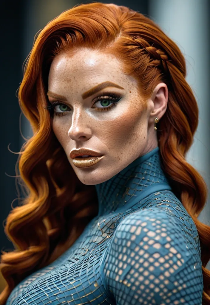 a surreal close-up of a woman with charmingly uneven features , big prismatic eyes that shimmer with rainbow reflections , and an elongated face that curves like the hands of a clock. Her neck arches delicately , draped with a scarf of shimmering threads that sparkle with tiny stars. Her hair cascades downward , transforming into a shimmering cascade of crystalline shards and faceted gems , each piece reflecting light in ornate , swirling patterns with tiny , prismatic fairies dancing between them. Her dress of ruby velvet dissolves into a crown jewels display , tiaras and scepters arranging into royal , ceremonial spirals. Her fingers stretch into slender alembics , dripping colorful elixirs that bloom into fantastical shapes midair. The background is a faceted sky , where prismatic clouds twist into decorative , crystalline curves. Highly detailed , ornate Art Nouveau composition , flowing decorative linework , elegant curves , balanced negative space , soft atmospheric perspective , painterly rendering , gentle bloom on highlights. ,