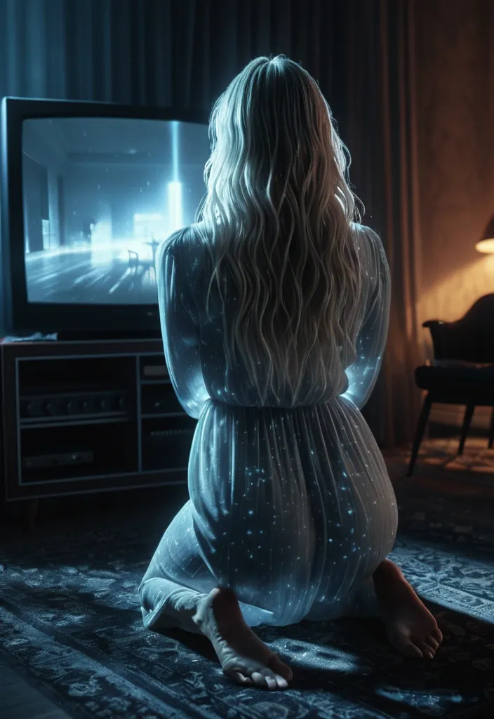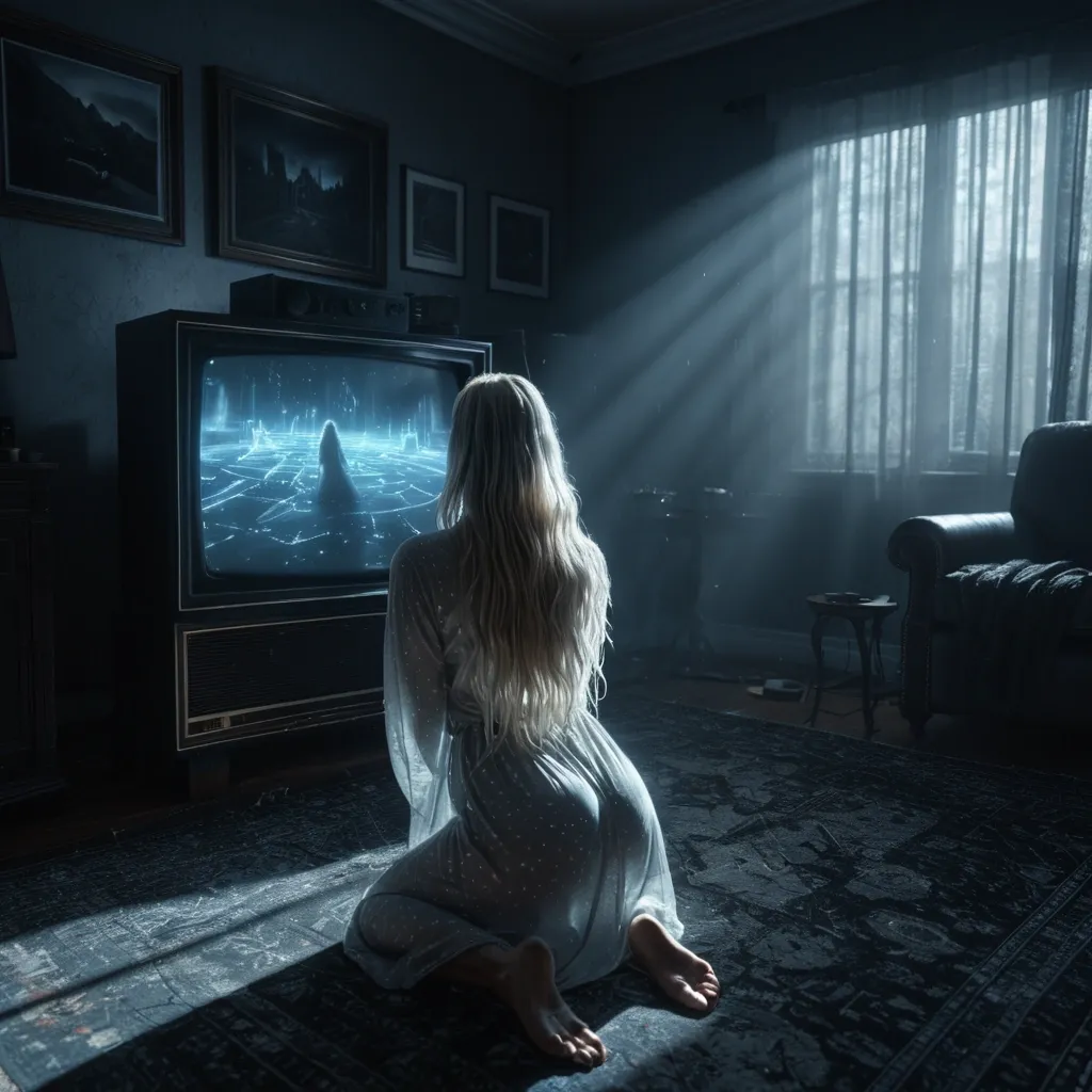Ultra-realistic cinematic 8K HDR scene inspired by the movie "Poltergeist" (1982) a small girl kneeling in front of an old 1980s television set glowing with white static noise she wears a light nightgown or pajamas , her long blonde hair illuminated by the cold bluish glow of the TV both hands gently touching the screen , creating a faint reflection and subtle distortion of her silhouette the dark living room around her is filled with shadows and faint outlines of furniture , toys scattered on the carpet soft volumetric light rays from the static flicker through the air , dust particles floating , faint ghostly glow emanating from the TV atmosphere eerie , silent , and supernatural , a sense of mystery and dread cinematic depth of field , ultra-detailed 3D photorealistic textures of hair , static light , and fabric IMAX-level realism , Unreal Engine 5 rendering , HDR color contrast , Canon EOS R5 35mm f/1.4 lens , masterpiece horror composition , haunting and iconic --ar 16:9 --raw --stylize 750 --v 6 ,