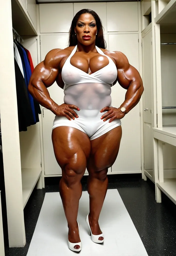 À african giant muscular chubby femalebodybuilder , housewife woman BBW musclée , heavy weight bodybuildeuse géante et plantureuse with giant chest , imposante dame massive , beautiful make up Gina Torres face , in a locker room , avec de gros seins , énormes biceps musclés , in white satin transparent shortest mini loose sundress with heels , exposant les seins , bras musclés exposés , dominante , jambes massives exposées , agressive , ,