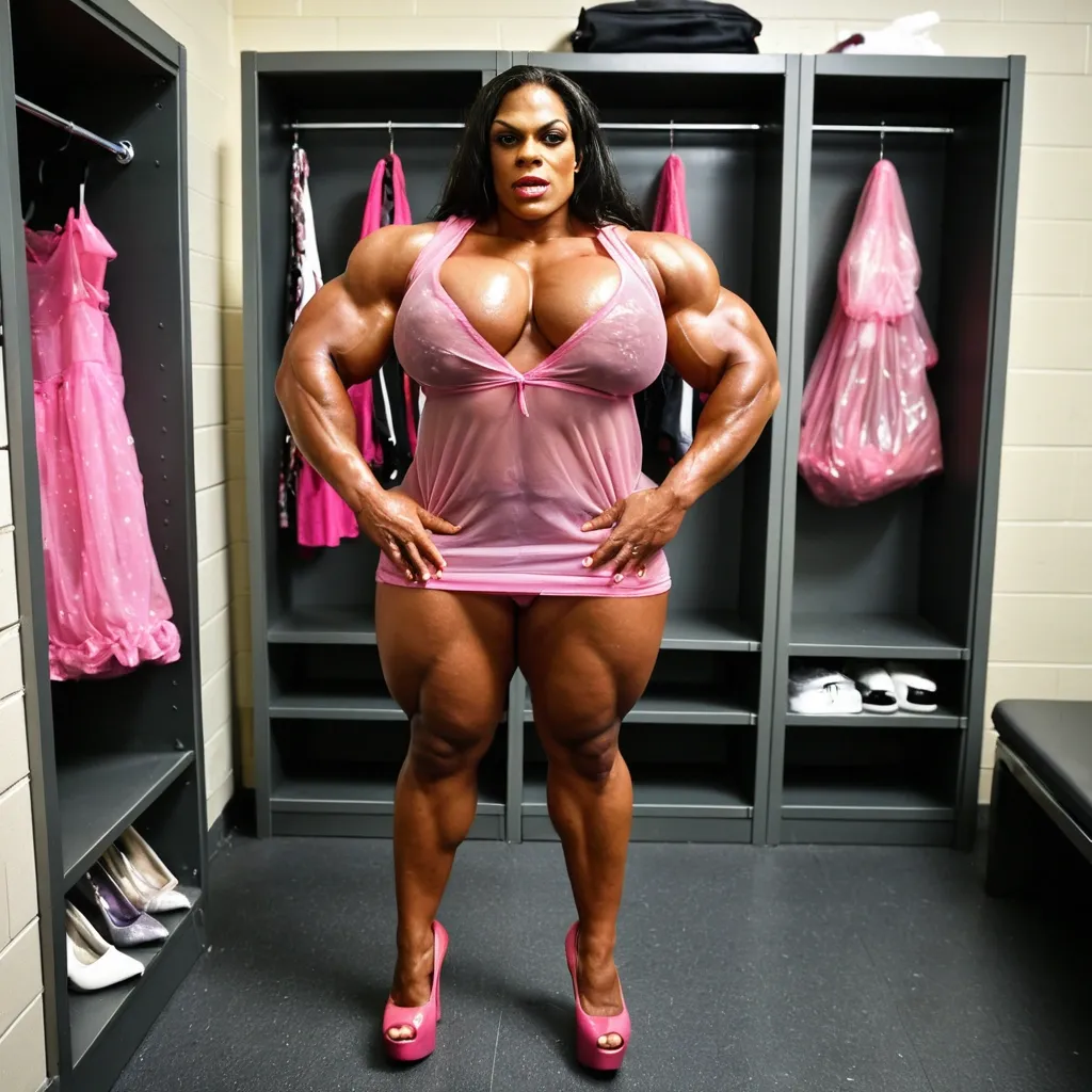 À african giant muscular chubby femalebodybuilder , housewife woman BBW musclée , heavy weight bodybuildeuse géante et plantureuse with giant chest , imposante dame massive , beautiful make up Phylicia Rashad face , in a locker room , avec de gros seins , énormes biceps musclés , in pink satin transparent shortest mini loose sundress with heels , exposant les seins , bras musclés exposés , dominante , jambes massives exposées , agressive , ,