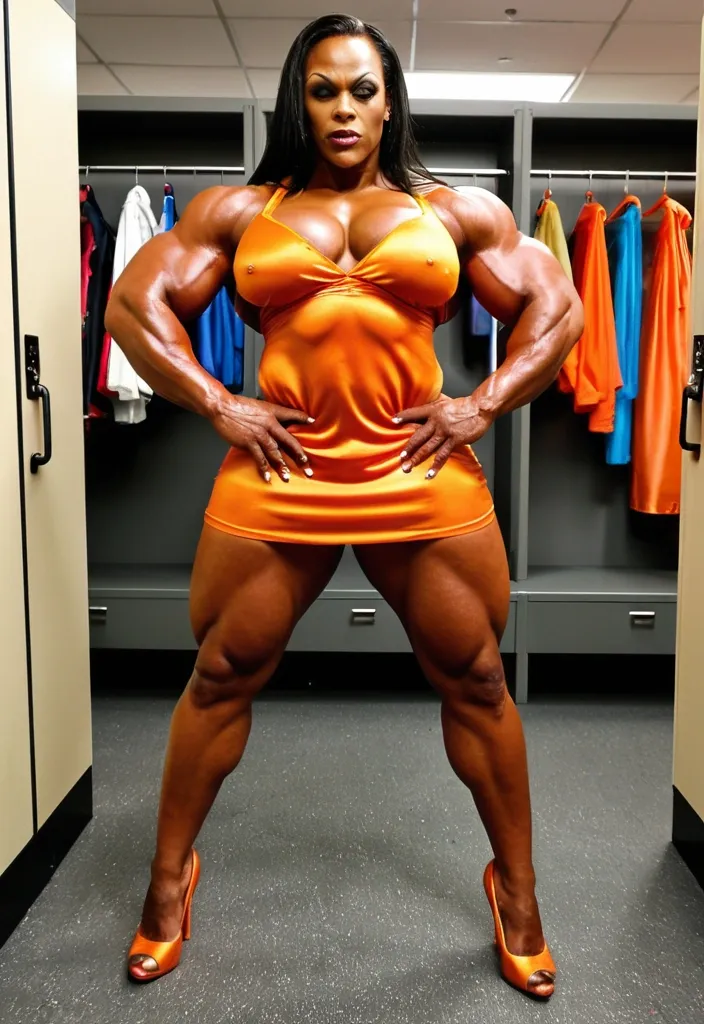 À african giant muscular chubby femalebodybuilder , housewife woman BBW musclée , heavy weight bodybuildeuse géante et plantureuse with giant chest , imposante dame massive , beautiful make up Zoé Saldana face , in a locker room , avec de gros seins , énormes biceps musclés , in orange satin transparent shortest mini loose sundress with heels , exposant les seins , bras musclés exposés , dominante , jambes massives exposées , agressive , ,