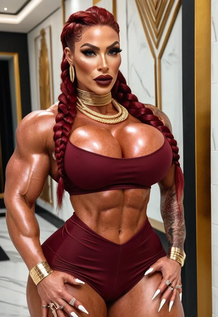 Generate Gorgeous female boss , bimbo , hourglass body , abnormally massive female bodybuilder , gorgeous , close up , full lips , big booty , redheaded , freckles on face and breast , braided design hair , feminine silhouette , too big breast , big booty , sexy thighs abs , silhouette , up close , flexing biceps , beautiful green eyes , legs are iconic and defining physical feature , both visually and in terms of combat ability.wearing an outfit that is a striking blend of elegance , power , and femininity , designed to command attention in any room. The suit is tailored to perfection , hugging the wearer’s curves with precision while emphasizing a structured silhouette. The fabric itself is a refined maroon , tweed patterned with subtle cream , giving the suit a texture that feels both velvet amd silk sophisticated and modern. The blazer features broad blue lapels and gold button accents , adding a luxurious touch that elevates the look beyond typical business attire. The matching high-waisted trousers elongate the frame , further enhancing the poised and commanding effect of the ensemble.The styling choices amplify the boldness of the suit. The inner blouse is a silky , greybutton-down shirt that complements the tweed’s tone while introducing a softer , feminine balance to the sharp tailoring of the jacket. The blouse peeks out neatly from under the blazer , maintaining elegance without drawing focus away from the suit’s commanding cut. Accessories are kept minimal yet intentional: a delicate layered gold necklace and hoop earrings that add glimmers of light and luxury without overpowering the outfit. The choice of voluminous , honey-brown braids cascading down her shoulders frames the face with both confidence and glamour , completing the commanding visual.Altogether , this look communicates a blend of authority and allure. It is business-ready yet fashion-forward , balancing corporate structure with vibrant femininity. The color palette maroon , cream and gold avoids being overly delicate , instead embracing the richness of texture , structure , and presence. This is the kind of ensemble that speaks to ambition , sophistication , and personal style—ideal for someone who thrives in positions of influence but insists on expressing her individuality with bold elegance. It’s not just clothing—it’s a statement of power wrapped in grace. In luxury living legs that could crush a watermelon , skirt , closed collar top , closed top. Closed top , crew neck top , futuristic t-shirt top , enormous butt , enormous breast , short fingernails ,