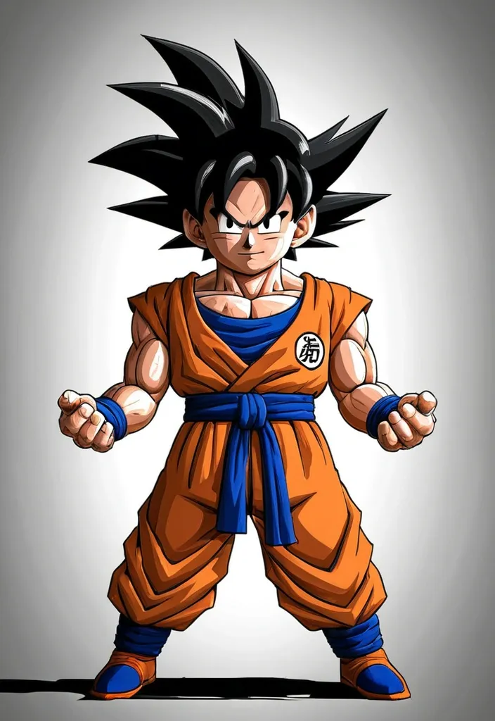Goku stands in a fighting stance , with an intense , concentrated look on his face. His messy black hair rises slightly on top of his head , and his body is tense and ready to attack. In the background , a mixture of starry sky and dark clouds can be seen , suggesting that the scene takes place at night. The atmosphere is tense and exciting , as if Goku is about to fight a powerful enemy. The image is created in anime style , with sharp lines and shadows and vibrant colours. As for the camera , the image is shot from below , as if the viewer is looking up at Goku , 3D. ,