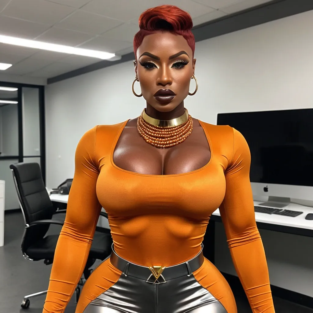 Generate Gorgeous 24 years old , female boss , dark-skinned African-American woman , pointy face , bimbo , hourglass body , abnormally massive female bodybuilder , gorgeous , close up , full lips , big booty , short stylish pixie hair cut futuristic mini afro , feminine silhouette , too big breast , big booty , sexy thighs abs , silhouette , up close , flexing biceps , beautiful brown eyes , legs are iconic and defining physical feature , both visually and in terms of combat ability.wearing an outfit that is a striking blend of elegance , power , and femininity , designed to command attention in any room. The suit is tailored to perfection , hugging the wearer’s curves with precision while emphasizing a structured silhouette. The fabric itself is a refined grey tweed patterned with subtle white grid lines , giving the suit a texture that feels both sophisticated and modern. The blazer features broad blue lapels and gold button accents , adding a luxurious touch that elevates the look beyond typical business attire. The matching high-waisted trousers elongate the frame , further enhancing the poised and commanding effect of the ensemble.The styling choices amplify the boldness of the suit. The inner blouse is a silky , greybutton-down shirt that complements the tweed’s tone while introducing a softer , feminine balance to the sharp tailoring of the jacket. The blouse peeks out neatly from under the blazer , maintaining elegance without drawing focus away from the suit’s commanding cut. Accessories are kept minimal yet intentional: a delicate layered gold necklace and hoop earrings that add glimmers of light and luxury without overpowering the outfit. The choice of voluminous , honey-brown braids cascading down her shoulders frames the face with both confidence and glamour , completing the commanding visual.Altogether , this look communicates a blend of authority and allure. It is business-ready yet fashion-forward , balancing corporate structure with vibrant femininity. The color palette blue , grey and gold avoids being overly delicate , instead embracing the richness of texture , structure , and presence. This is the kind of ensemble that speaks to ambition , sophistication , and personal style—ideal for someone who thrives in positions of influence but insists on expressing her individuality with bold elegance. It’s not just clothing—it’s a statement of power wrapped in grace. In luxury living legs that could crush a watermelon , skirt high boots are a bold and striking statement piece , crafted in glossy black patent leather that gives them a sleek , polished finish. Rising to just below the knee , the boots feature three adjustable buckle straps along the shaft , adding both edge and detail to their design. The towering stiletto heel , paired with a thick platform sole , creates an ultra-dramatic silhouette that elongates the leg and exudes power and confidence. With their combination of shine , height , and structure , these boots perfectly balance fierce femininity with high-fashion allure. High cheekbones , prominent jawline , gorgeous big brown light hazel honey , dark red hair , enormous breast , orange velvet t-shirt , gold futuristic necklace , grey designer pants in office building ,