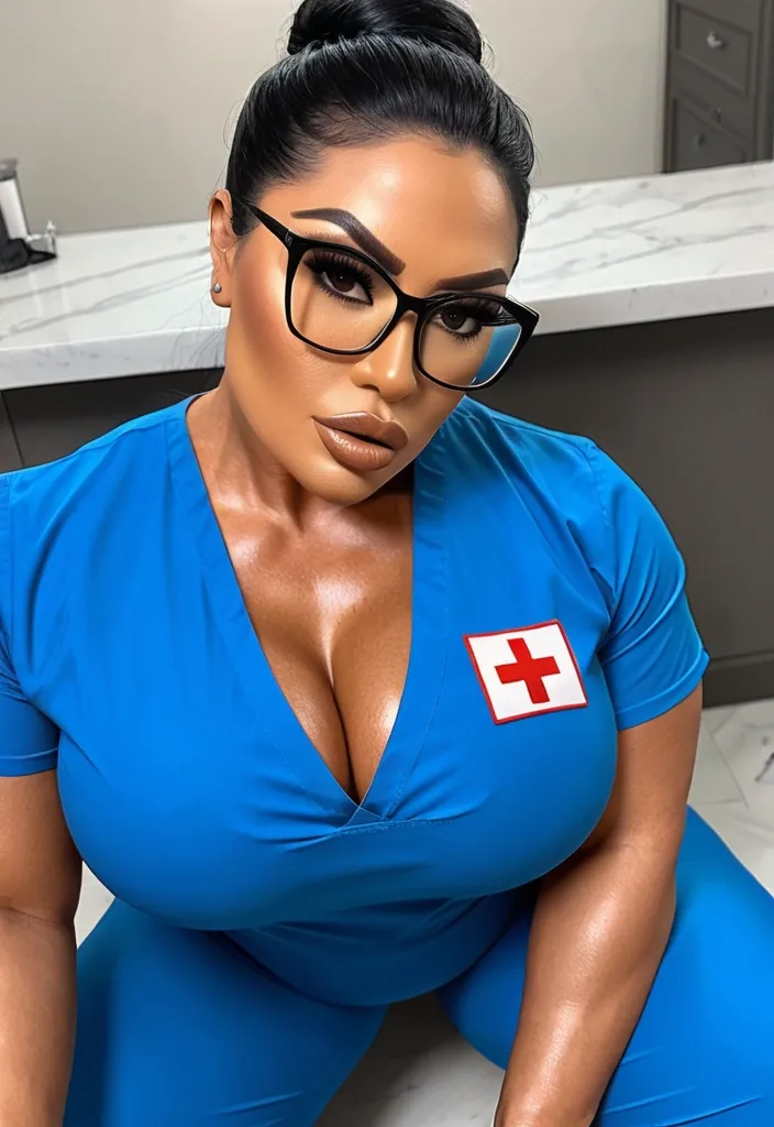 Generate Gorgeous female nurse , bimbo , hourglass body , golden brown skin complexion. abnormally massive female bodybuilder , gorgeous , close up , full lips , big booty , black hair , eye glasses , Philippine woman , black pompadour stylish hair , feminine silhouette , too big breast , big booty , sexy thighs abs , silhouette , up close , flexing biceps , beautiful green eyes , legs are iconic and defining physical feature , both visually and in terms of combat ability.wearing an outfit that is a striking blend of elegance , power , and femininity , designed to command attention in any room. The suit is tailored to perfection , hugging the wearer’s curves with precision while emphasizing a structured silhouette. The fabric itself is a refined grey tweed patterned with subtle white grid lines , giving the suit a texture that feels both sophisticated and modern. The blazer features broad blue lapels and gold button accents , adding a luxurious touch that elevates the look beyond typical business attire. The matching high-waisted trousers elongate the frame , further enhancing the poised and commanding effect of the ensemble.The styling choices amplify the boldness of the suit. The inner blouse is a silky , greybutton-down shirt that complements the tweed’s tone while introducing a softer , feminine balance to the sharp tailoring of the jacket. The blouse peeks out neatly from under the blazer , maintaining elegance without drawing focus away from the suit’s commanding cut. Accessories are kept minimal yet intentional: a delicate layered gold necklace and hoop earrings that add glimmers of light and luxury without overpowering the outfit. The choice of voluminous , honey-brown braids cascading down her shoulders frames the face with both confidence and glamour , completing the commanding visual.Altogether , this look communicates a blend of authority and allure. It is business-ready yet fashion-forward , balancing corporate structure with vibrant femininity. The color palette blue , grey and gold avoids being overly delicate , instead embracing the richness of texture , structure , and presence. This is the kind of ensemble that speaks to ambition , sophistication , and personal style—ideal for someone who thrives in positions of influence but insists on expressing her individuality with bold elegance. It’s not just clothing—it’s a statement of power wrapped in grace. In luxury living legs that could crush a watermelon , skirt high boots are a bold and striking statement piece , crafted in glossy black patent leather that gives them a sleek , polished finish. Rising to just below the knee , the boots feature three adjustable buckle straps along the shaft , adding both edge and detail to their design. The towering stiletto heel , paired with a thick platform sole , creates an ultra-dramatic silhouette that elongates the leg and exudes power and confidence. With their combination of shine , height , and structure , these boots perfectly balance fierce femininity with high-fashion allure. High cheekbones , prominent jawline , gorgeous big brown eyes , powerful curves , enormous breast , sitting in blue scrubs , scrub top , scrub pants , voluptuous , up close shot , ,