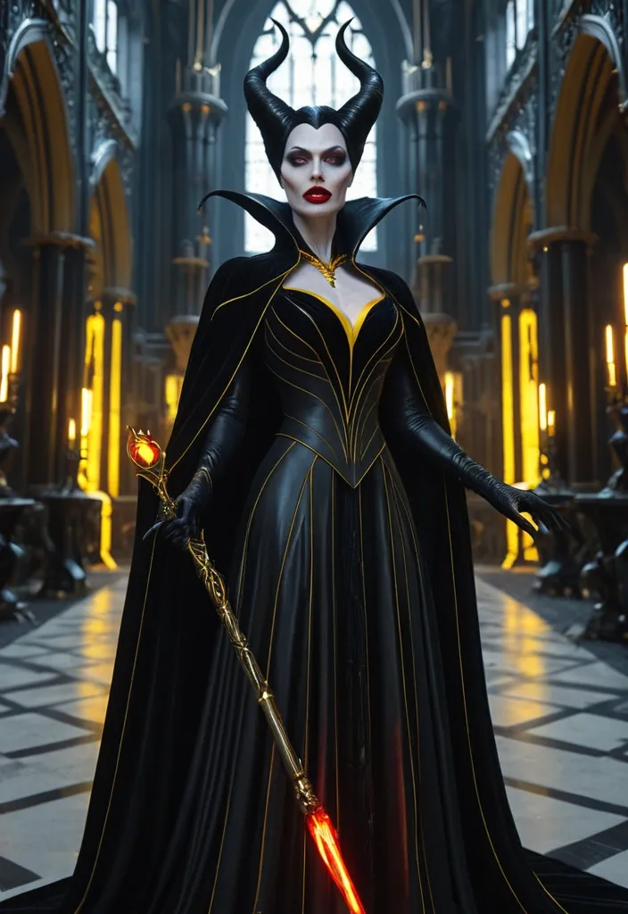 spell motion capture of Maleficent disney character , a real beautiful elegance woman with glowing yellow eyes and scarlet lips , intricate high shaped hairstyle , in very long black cape velvet , she hold magical staff in hand , thron hall in background , gorgeous , Intricate epic wide shot , perspective darkfantasy , CGI , depth focus , photorealistic , realistic detailed , complicated , complicated maximalist hyperrealistic , UHD 1080p , HQ , CGSociety ar-9:16 ,