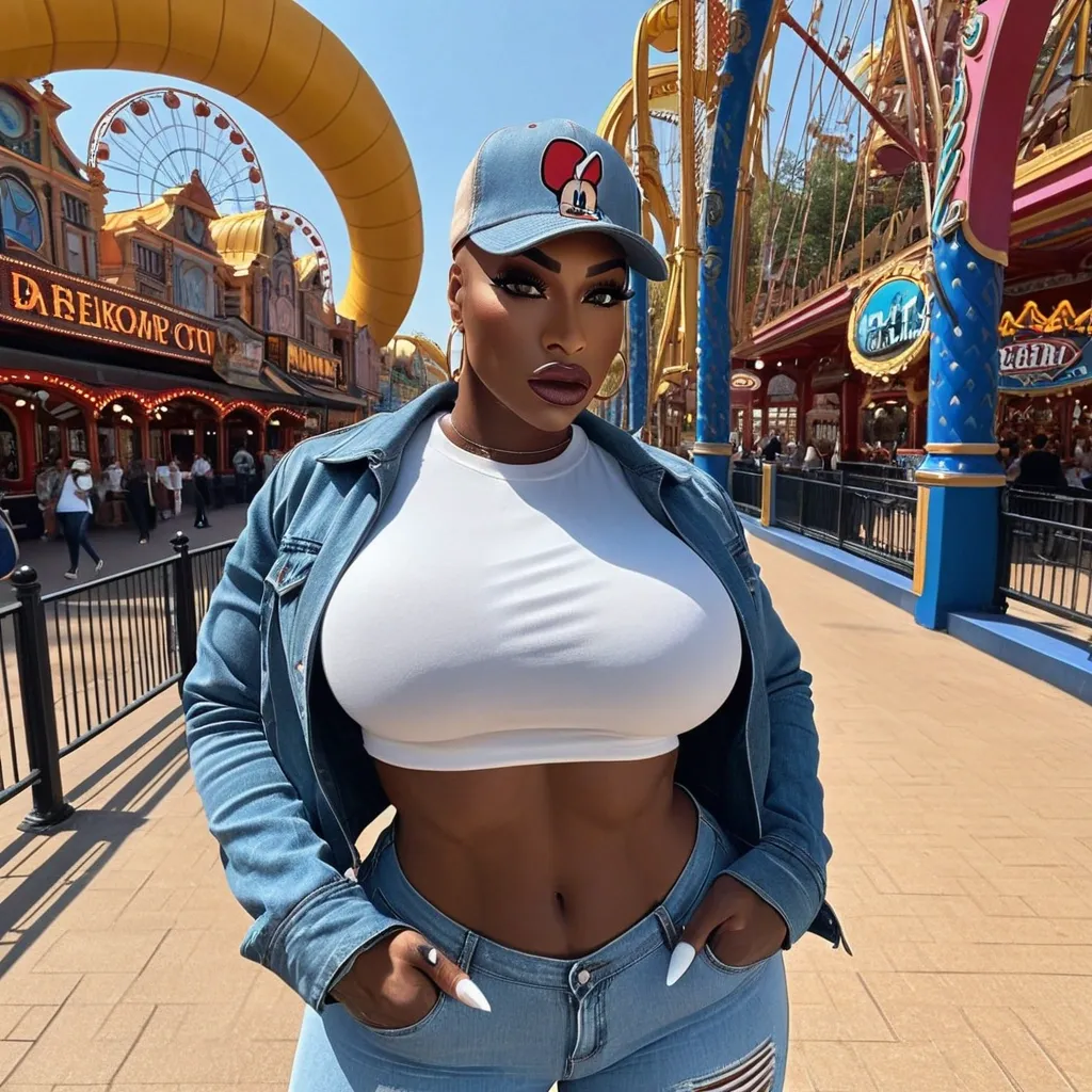 Generate Gorgeous female boss , bimbo , very dark-skinned African-American female , hourglass body , abnormally massive female bodybuilder , gorgeous , close up , full lips , big booty , brown , on face and breast , short pixie hair , shaved on the side , feminine silhouette , too big breast , big booty , sexy thighs abs , silhouette , up close , flexing biceps , beautiful green eyes , legs are iconic and defining physical feature , both visually and in terms of combat ability.wearing an outfit that is a striking blend of elegance , power , and femininity , designed to command attention in any room. The suit is tailored to perfection , hugging the wearer’s curves with precision while emphasizing a structured silhouette. The fabric itself is a refined grey tweed patterned with subtle white grid lines , giving the suit a texture that feels both sophisticated and modern. The blazer features broad blue lapels and gold button accents , adding a luxurious touch that elevates the look beyond typical business attire. The matching high-waisted trousers elongate the frame , further enhancing the poised and commanding effect of the ensemble.The styling choices amplify the boldness of the suit. The inner blouse is a silky , greybutton-down shirt that complements the tweed’s tone while introducing a softer , feminine balance to the sharp tailoring of the jacket. The blouse peeks out neatly from under the blazer , maintaining elegance without drawing focus away from the suit’s commanding cut. Accessories are kept minimal yet intentional: a delicate layered gold necklace and hoop earrings that add glimmers of light and luxury without overpowering the outfit. The choice of voluminous , honey-brown braids cascading down her shoulders frames the face with both confidence and glamour , completing the commanding visual.Altogether , this look communicates a blend of authority and allure. It is business-ready yet fashion-forward , balancing corporate structure with vibrant femininity. The color palette blue , grey and gold avoids being overly delicate , instead embracing the richness of texture , structure , and presence. This is the kind of ensemble that speaks to ambition , sophistication , and personal style—ideal for someone who thrives in positions of influence but insists on expressing her individuality with bold elegance. It’s not just clothing—it’s a statement of power wrapped in grace. In luxury living legs that could crush a watermelon , skirt high boots are a bold and striking statement piece , crafted in glossy black patent leather that gives them a sleek , polished finish. Rising to just below the knee , the boots feature three adjustable buckle straps along the shaft , adding both edge and detail to their design. The towering stiletto heel , paired with a thick platform sole , creates an ultra-dramatic silhouette that elongates the leg and exudes power and confidence. With their combination of shine , height , and structure , these boots perfectly balance fierce femininity with high-fashion allure. High cheekbones , prominent jawline , gorgeous big light reflecting hazel eyes , enormous breast , denim jacket , cartoon bunny on white t-shirt-shirt , denim pants , denim baseball cap walking in amusement park , ,