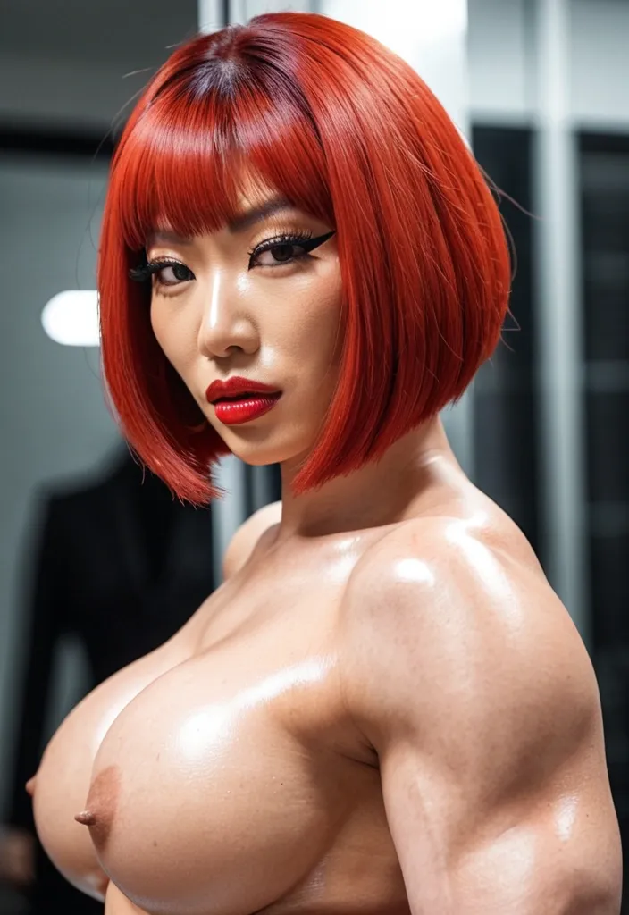 Generate Gorgeous female boss , bimbo , hourglass body , Japanese woman , abnormally massive female bodybuilder , gorgeous , close up , full lips , big booty , red hair , short bob-cut hair , , feminine silhouette , too big breast , big booty , sexy thighs abs , silhouette , up close , flexing biceps , beautiful brown eyes , legs are iconic and defining physical feature , both visually and in terms of combat ability.wearing an outfit that is a striking blend of elegance , power , and femininity , designed to command attention in any room. Outfit tailored to perfection , hugging the wearer’s curves with precision while emphasizing a structured silhouette. The fabric texture that feels both sophisticated and modern. The tank top features a luxurious touch that elevates the look beyond typical attire. The matching high-waisted shorts elongate the frame , further enhancing the poised and commanding effect of the ensemble.The styling choices amplify the boldness of the outfit. The outfit complements the tweed’s tone while introducing a softer , feminine balance to the sharp tailoring of the outfit. She is maintaining elegance without drawing focus away from the outfit commanding cut. Accessories are kept minimal yet intentional: a delicate layered gold necklace and hoop earrings that add glimmers of light and luxury without overpowering the outfit. The choice of voluminous , short bob-cut hair cascading down to her shoulders frames the face with both confidence and glamour , completing the commanding visual.Altogether , this look communicates a blend of authority and allure. It is fashion-forward , balancing corporate structure with vibrant femininity. The color palette blue tank top and grey short avoids being overly delicate , instead embracing the richness of texture , structure , and presence. This is the kind of ensemble that speaks to ambition , sophistication , and personal style—ideal for someone who thrives in positions of influence but insists on expressing her individuality with bold elegance. It’s not just clothing—it’s a statement of power wrapped in grace. In luxury living legs that could crush a cement block , she has a bold and striking statement piece , her big lips heart shaped lips in glossy red that gives them a sleek , polished finish. Adding both edge and detail to their design. The towering stiletto heel , paired with a thick platform sole , creates an ultra-dramatic silhouette that elongates the leg and exudes power and confidence. With their combination of shine , height , and structure , these boots perfectly balance fierce femininity with high-fashion allure. High cheekbones , prominent jawline , in apartment gorgeous big brown eyes , enormous breast , blue tank top , high rise grey short , enormous butt ,