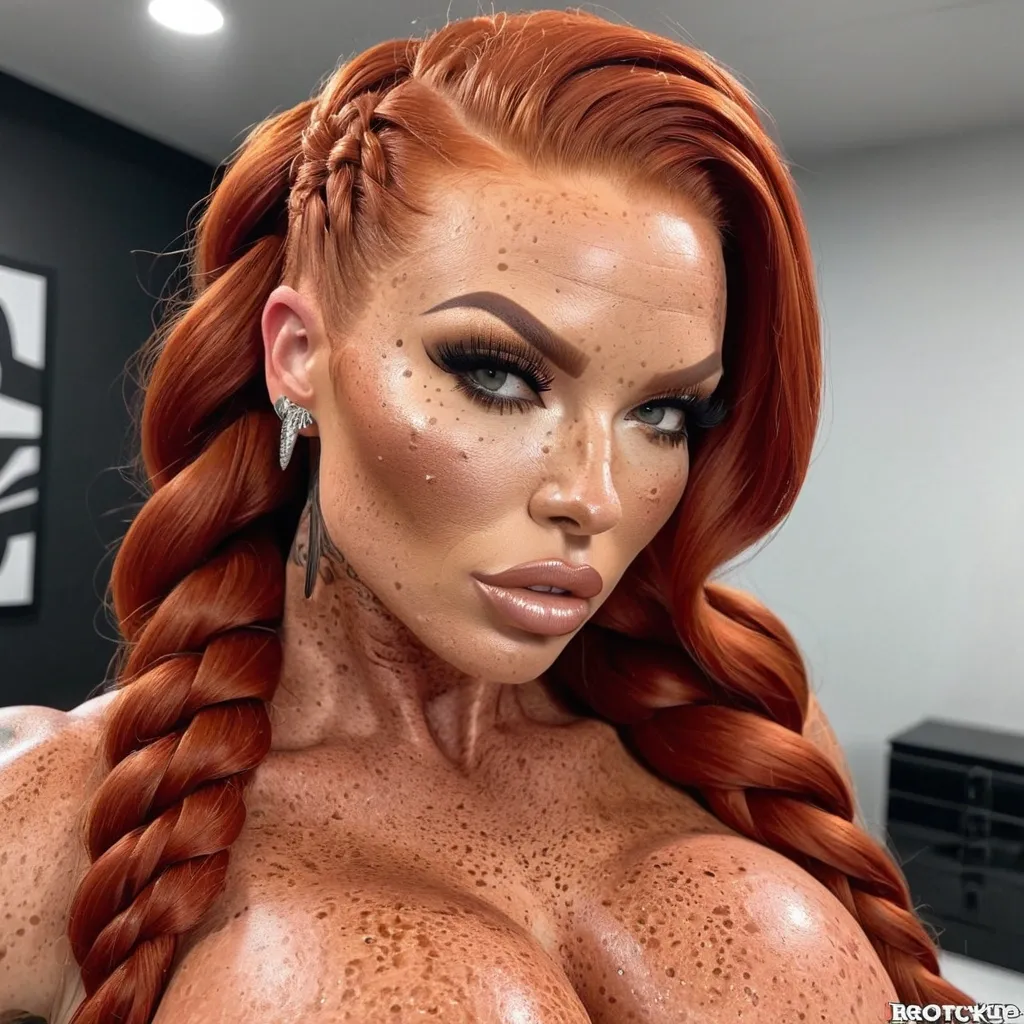 Generate Gorgeous female boss , bimbo , hourglass body , abnormally massive female bodybuilder , gorgeous , close up , full lips , big booty , redheaded , freckles on face and breast , braided design hair , feminine silhouette , too big breast , big booty , sexy thighs abs , silhouette , up close , flexing biceps , beautiful green eyes , legs are iconic and defining physical feature , both visually and in terms of combat ability.wearing an outfit that is a striking blend of elegance , power , and femininity , designed to command attention in any room. The suit is tailored to perfection , hugging the wearer’s curves with precision while emphasizing a structured silhouette. The fabric itself is a refined grey tweed patterned with subtle white grid lines , giving the suit a texture that feels both sophisticated and modern. The blazer features broad blue lapels and gold button accents , adding a luxurious touch that elevates the look beyond typical business attire. The matching high-waisted trousers elongate the frame , further enhancing the poised and commanding effect of the ensemble.The styling choices amplify the boldness of the suit. The inner blouse is a silky , greybutton-down shirt that complements the tweed’s tone while introducing a softer , feminine balance to the sharp tailoring of the jacket. The blouse peeks out neatly from under the blazer , maintaining elegance without drawing focus away from the suit’s commanding cut. Accessories are kept minimal yet intentional: a delicate layered gold necklace and hoop earrings that add glimmers of light and luxury without overpowering the outfit. The choice of voluminous , honey-brown braids cascading down her shoulders frames the face with both confidence and glamour , completing the commanding visual.Altogether , this look communicates a blend of authority and allure. It is business-ready yet fashion-forward , balancing corporate structure with vibrant femininity. The color palette blue , grey and gold avoids being overly delicate , instead embracing the richness of texture , structure , and presence. This is the kind of ensemble that speaks to ambition , sophistication , and personal style—ideal for someone who thrives in positions of influence but insists on expressing her individuality with bold elegance. It’s not just clothing—it’s a statement of power wrapped in grace. In luxury living legs that could crush a watermelon , skirt high boots are a bold and striking statement piece , crafted in glossy black patent leather that gives them a sleek , polished finish. Rising to just below the knee , the boots feature three adjustable buckle straps along the shaft , adding both edge and detail to their design. The towering stiletto heel , paired with a thick platform sole , creates an ultra-dramatic silhouette that elongates the leg and exudes power and confidence. With their combination of shine , height , and structure , these boots perfectly balance fierce femininity with high-fashion allure. ,