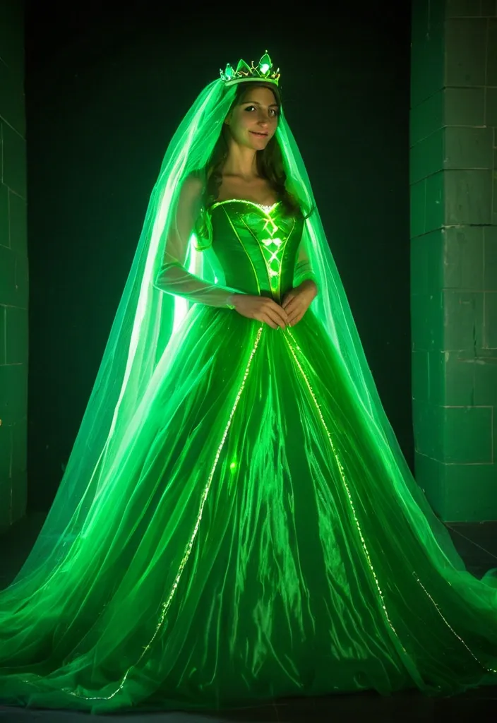 full-length portrait of a beautiful woman standing in a forest near Rivendell , elegant dark green dress with golden leaf embroidery , dress ends 10 cm above the knee. Appearance resembles Vanessa Kirby , body like Emilia Clarke , bright emerald green eyes , kind gaze , warm smile. She is standing on a mossy path , surrounded by ancient trees , elven architecture visible in the background. Soft sunlight , cinematic lighting , hyper-detailed , photorealistic , 8k , serene atmosphere. ,