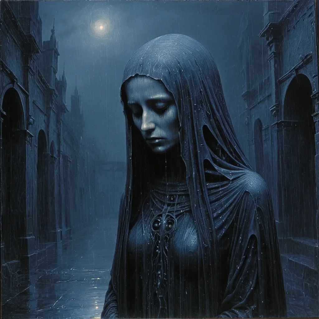 A single tear falls from a woman's eye , merging with the rain. The scene is painted in a dark , ethereal style with chiaroscuro lighting , evoking a sense of gothic romanticism and melancholic beauty. The color palette relies on deep blues , purples , and greys , with a subtle luminescence in the falling rain. Inspired by the moody , atmospheric works of Zdzisław Beksiński and H.R. Giger , with a touch of the surrealist drama of Remedios Varo. The overall mood is one of profound sadness , lost love , and cathartic release. ,