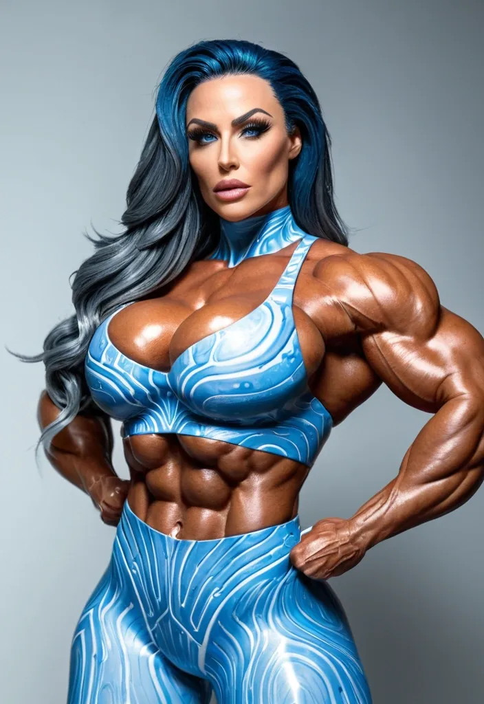 Her eyes are large , almond-shaped , and a striking icy blue-gray , heavily emphasized with long lashes and a piercing gaze that looks directly at the viewer. The sclera is bright white , the irises detailed with radial patterns and tiny highlights , giving them an almost luminous quality. There is a slight upward tilt at the outer corners , enhancing commanding expression. The eyebrows are thick , perfectly arched , and darker than the hair , framing the eyes dramatically.Her body is the most exaggerated aspect of the image , built to extreme proportions that combine hyper-muscularity with hyper-feminine curves. Shoulders are broad and powerfully capped , arms thick with vascular , sculpted muscle , and abs are deeply etched in an almost anatomical level of definition. Yet the waist remains improbably narrow before flaring into extremely wide hips and massive , rounded glutes. The bust is enormously enlarged far beyond natural human proportions , defying both gravity and realism , with the white wrap struggling to contain it. Every muscle is highlighted with glossy oil-like shine , emphasizing separation and size; the overall physique is a fantasy hybrid of competitive female bodybuilder and exaggerated hourglass pin-up. Enornmout butt , enormous breast.powerful hourglass silhouette , stacked , gorgeous blue eyes , blue cropped tank top and , grey pants ,