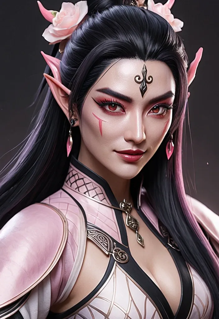 Generate a dungeons and dragons character portrait of the face of a femme nonbinary half eladrin elf half human with a delicate appearance. She is a thief and warlock. Her hair color is a rose-quartz pink with black streaks . Her hair is very long , silky and is in the style of a wuxia female character. she has bright black eyes and a little bit of an east asian look to her features and clothing , a sly and mischievous smile , with thick arched brows , gleaming clever and naughty eyes , heart shaped face. Her attire is styled like a heroic female character in a chinese fantasy wuxia genre history drama ,
