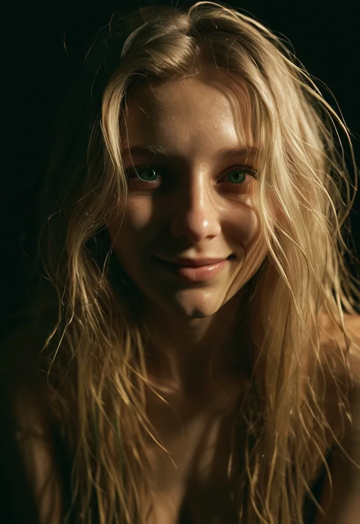 Close-up portrait of a shyly smiling woman with long , messy blonde hair covering her chest , her eyes hidden by the flowing strands. Volumetric chiaroscuro lighting imbues the scene with moody shadows and complex , low-key illumination. Shot with a 50mm F1.2L lens for shallow depth of field , producing a high dynamic range analog color film photograph with radiant green eyes and subsurface scattering. Photorealistic , RAW photography quality , with a inusual gorgeous pose and emotional depth. ar-3:4 ,