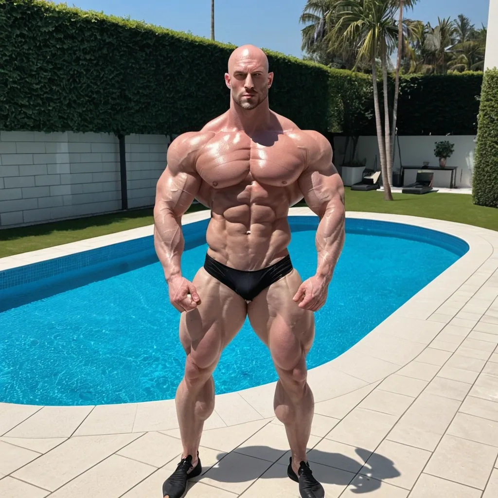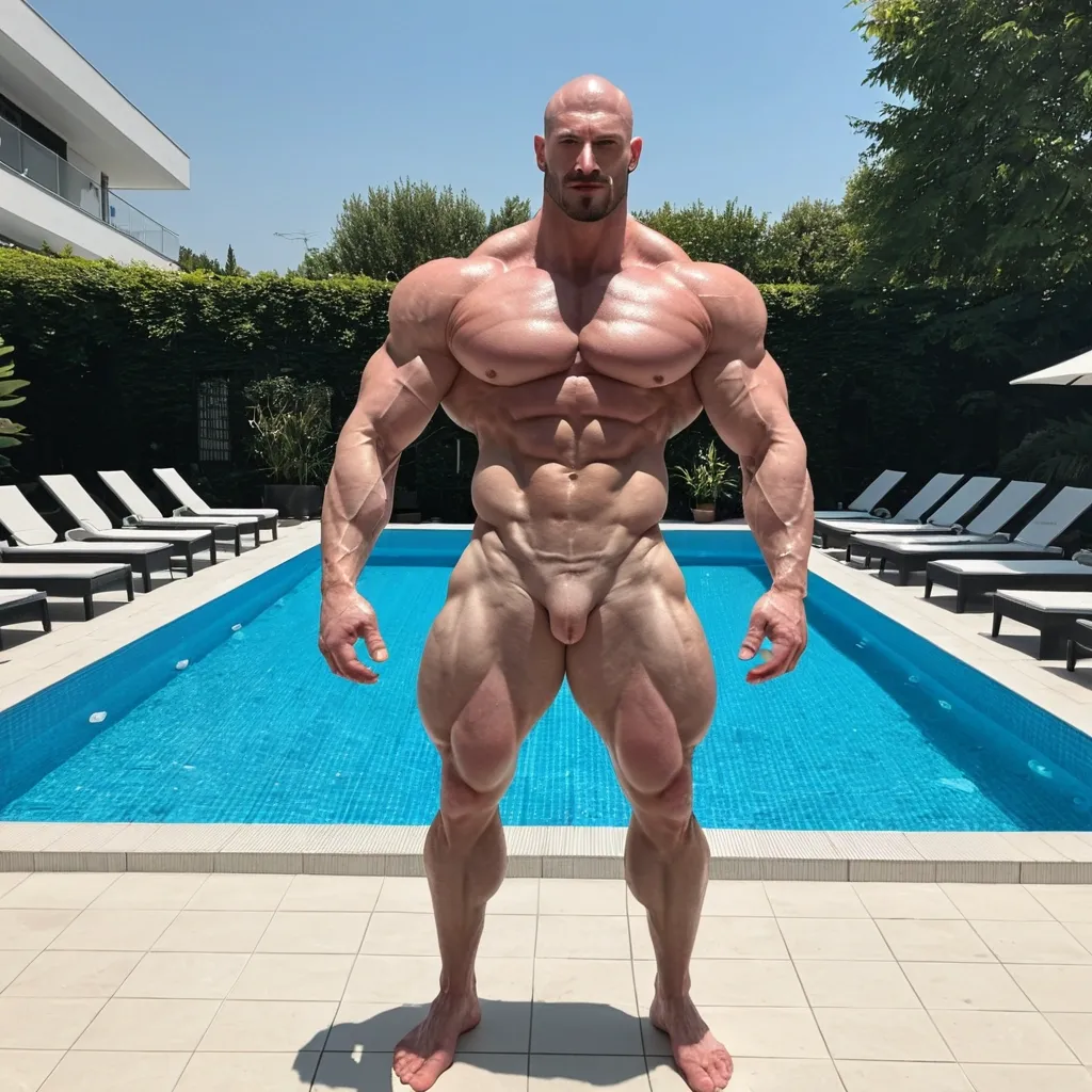 handsome pale skin german bodybuilder in swimming pool area 23yo round pecs wide arms vascular muscles muscular legs bald ,