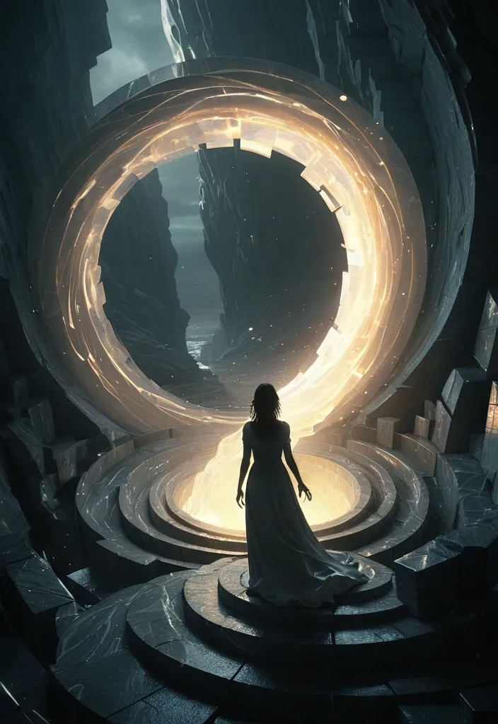 A lone woman stands at the precipice of a swirling vortex , bathed in an ethereal glow , reaching out towards fragmented marble cubes that seem to reform into a distant , hopeful horizon. The scene is rendered in a dark fantasy concept art style , with dramatic chiaroscuro lighting and an unsettling yet beautiful atmosphere. ,