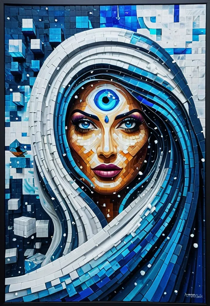 A surreal scene where swirl across the canvas , merging into a chaotic yet elegant Liquid. From this chromatic storm , a young woman head with blue eye with her head covered from traditional Saree peeks out from a window emerges , her form defined only by the negative space of surrounding. The environment is fluid and dreamlike , evoking symbolism , sparkling pixel cubes that seem to melt and reform. ,