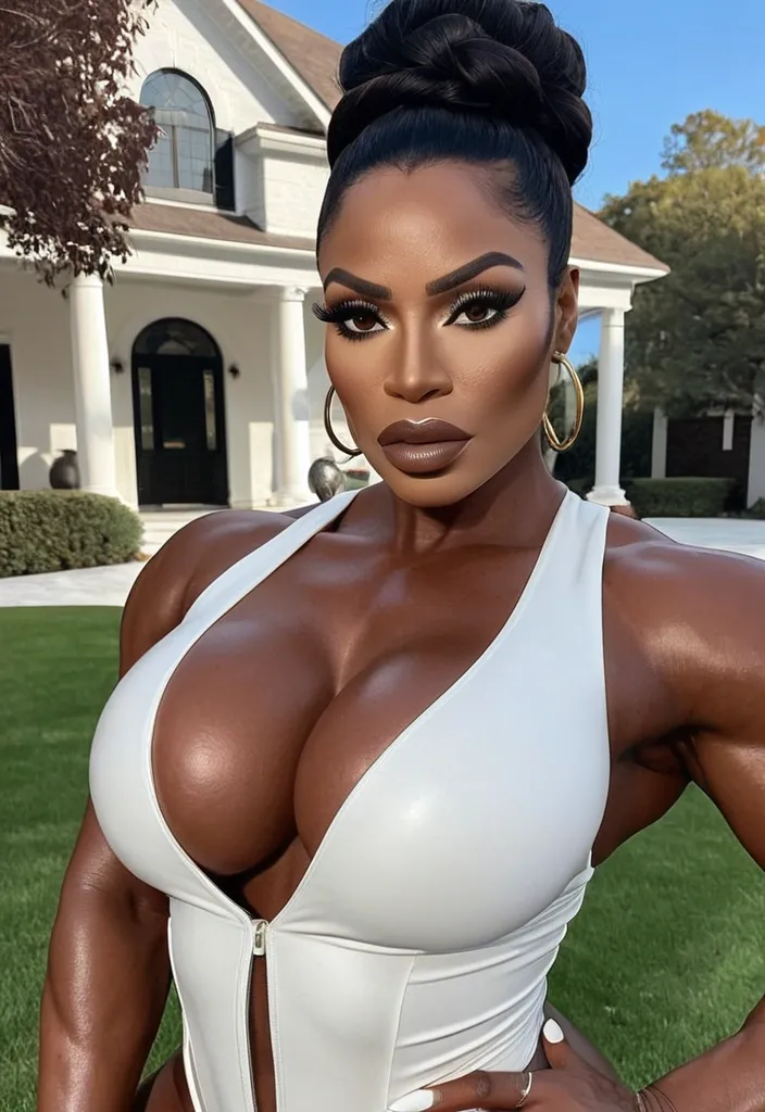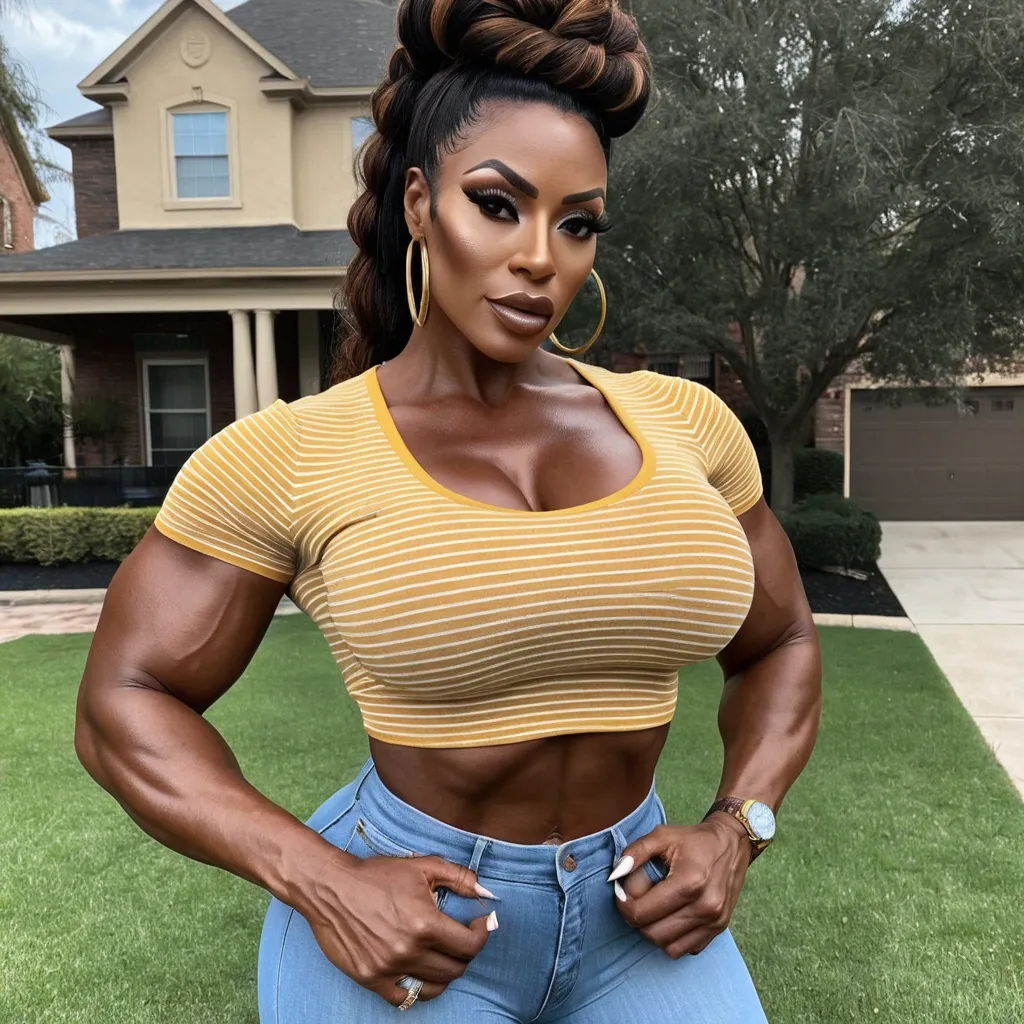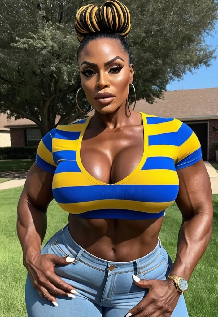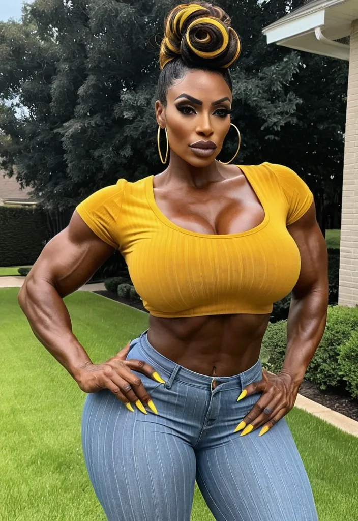 Generate Gorgeous 37 years old , female boss , dark-skinned African-American woman , bimbo , hourglass body , abnormally massive female bodybuilder , gorgeous , close up , full lips , big booty , brown , updo , feminine silhouette , too big breast , big booty , sexy thighs abs , silhouette , up close , flexing biceps , beautiful brown eyes , legs are iconic and defining physical feature , both visually and in terms of combat ability.wearing an outfit that is a striking blend of elegance , power , and femininity , designed to command attention in any room. The suit is tailored to perfection , hugging the wearer’s curves with precision while emphasizing a structured silhouette. The fabric itself is a refined grey tweed patterned with subtle white grid lines , giving the suit a texture that feels both sophisticated and modern. The blazer features broad blue lapels and gold button accents , adding a luxurious touch that elevates the look beyond typical business attire. The matching high-waisted trousers elongate the frame , further enhancing the poised and commanding effect of the ensemble.The styling choices amplify the boldness of the suit. The inner blouse is a silky , greybutton-down shirt that complements the tweed’s tone while introducing a softer , feminine balance to the sharp tailoring of the jacket. The blouse peeks out neatly from under the blazer , maintaining elegance without drawing focus away from the suit’s commanding cut. Accessories are kept minimal yet intentional: a delicate layered gold necklace and hoop earrings that add glimmers of light and luxury without overpowering the outfit. The choice of voluminous , honey-brown braids cascading down her shoulders frames the face with both confidence and glamour , completing the commanding visual.Altogether , this look communicates a blend of authority and allure. It is business-ready yet fashion-forward , balancing corporate structure with vibrant femininity. The color palette blue , grey and gold avoids being overly delicate , instead embracing the richness of texture , structure , and presence. This is the kind of ensemble that speaks to ambition , sophistication , and personal style—ideal for someone who thrives in positions of influence but insists on expressing her individuality with bold elegance. It’s not just clothing—it’s a statement of power wrapped in grace. In luxury living legs that could crush a watermelon , skirt high boots are a bold and striking statement piece , crafted in glossy black patent leather that gives them a sleek , polished finish. Rising to just below the knee , the boots feature three adjustable buckle straps along the shaft , adding both edge and detail to their design. The towering stiletto heel , paired with a thick platform sole , creates an ultra-dramatic silhouette that elongates the leg and exudes power and confidence. With their combination of shine , height , and structure , these boots perfectly balance fierce femininity with high-fashion allure. High cheekbones , prominent jawline , gorgeous big brown eyes , freckles , enormous breast , grey denim pants , yellow and blue horizontal striped v neck t- shirt , skirt , front yard gorgeous brown eyes , ,