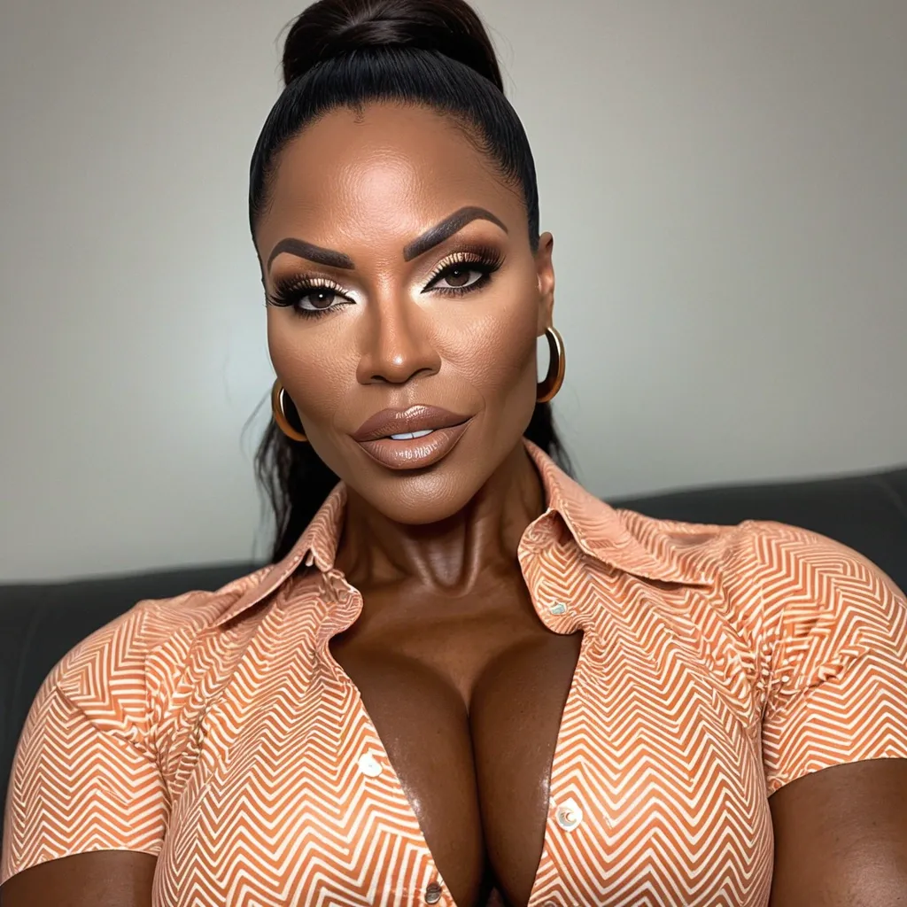 Generate Gorgeous female boss , bimbo , 42 years old , African-American woman , , , hourglass body , black mole subtle mole , over lip , beige lips gloss , abnormally massive female bodybuilder , gorgeous , close up , full lips , big booty , brown hair , in ponytail , feminine silhouette , too big breast , big booty , sexy thighs abs , silhouette , up close , flexing biceps , beautiful brown eyes , legs are iconic and defining physical feature , both visually and in terms of combat ability.wearing an outfit that is a striking blend of elegance , power , and femininity , designed to command attention in any room. The suit is tailored to perfection , hugging the wearer’s curves with precision while emphasizing a structured silhouette. The fabric itself is a refined grey tweed patterned with subtle white grid lines , giving the suit a texture that feels both sophisticated and modern. The blazer features broad blue lapels and gold button accents , adding a luxurious touch that elevates the look beyond typical business attire. The matching high-waisted trousers elongate the frame , further enhancing the poised and commanding effect of the ensemble.The styling choices amplify the boldness of the suit. The inner blouse is a silky , greybutton-down shirt that complements the tweed’s tone while introducing a softer , feminine balance to the sharp tailoring of the jacket. The blouse peeks out neatly from under the blazer , maintaining elegance without drawing focus away from the suit’s commanding cut. Accessories are kept minimal yet intentional: a delicate layered gold necklace and hoop earrings that add glimmers of light and luxury without overpowering the outfit. The choice of voluminous , honey-brown braids cascading down her shoulders frames the face with both confidence and glamour , completing the commanding visual.Altogether , this look communicates a blend of authority and allure. It is business-ready yet fashion-forward , balancing corporate structure with vibrant femininity. The color palette blue , grey and gold avoids being overly delicate , instead embracing the richness of texture , structure , and presence. This is the kind of ensemble that speaks to ambition , sophistication , and personal style—ideal for someone who thrives in positions of influence but insists on expressing her individuality with bold elegance. It’s not just clothing—it’s a statement of power wrapped in grace. In luxury living legs that could crush a watermelon , skirt high boots are a bold and striking statement piece , crafted in glossy black patent leather that gives them a sleek , polished finish. Rising to just below the knee , the boots feature three adjustable buckle straps along the shaft , adding both edge and detail to their design. The towering stiletto heel , paired with a thick platform sole , creates an ultra-dramatic silhouette that elongates the leg and exudes power and confidence. With their combination of shine , height , and structure , these boots perfectly balance fierce femininity with high-fashion allure. High cheekbones , prominent jawline , gorgeous big brown eyes , freckles , enormous breast , bluish beige and orange chevrons designed oxford shirt , goosebumps on chest , denim pants , up close shot ,