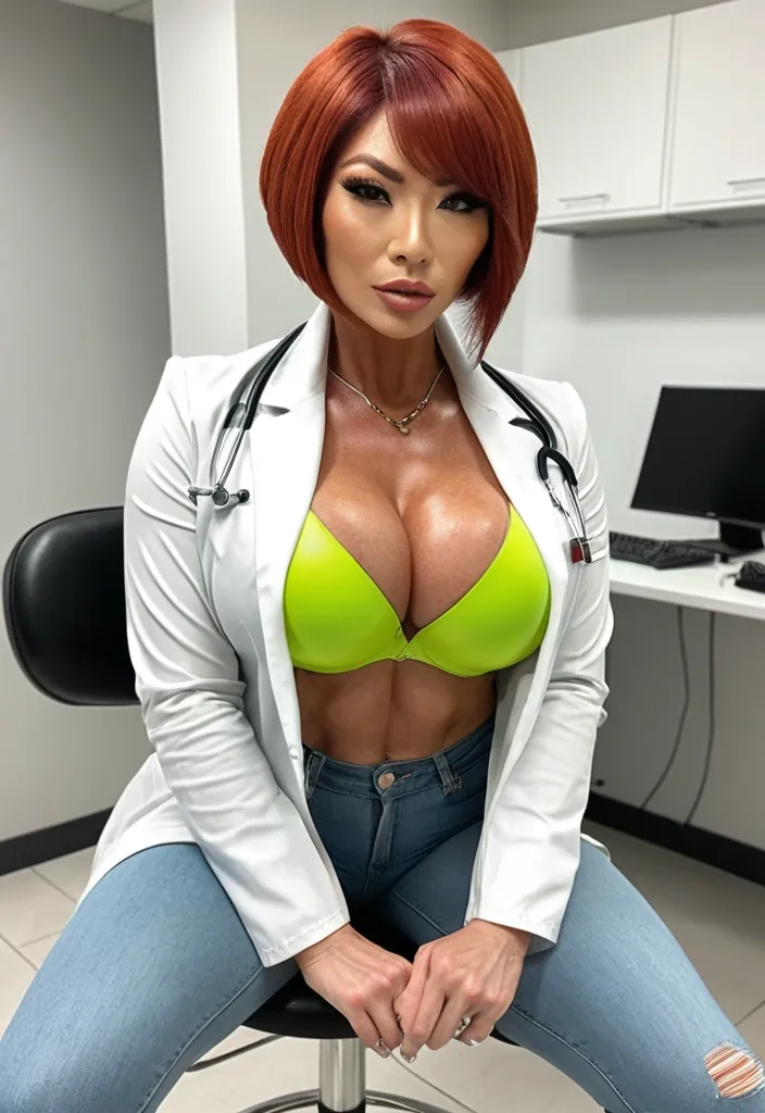 Generate Gorgeous female doctor , bimbo , Japanese woman , , hourglass body , abnormally massive female bodybuilder , gorgeous , close up , full lips , big booty , red hair , bob-cut , short hair , feminine silhouette , too big breast , big booty , sexy thighs abs , silhouette , up close , flexing biceps , beautiful brown eyes , legs are iconic and defining physical feature , both visually and in terms of combat ability.wearing an outfit that is a striking blend of elegance , power , and femininity , designed to command attention in any room. The suit is tailored to perfection , hugging the wearer’s curves with precision while emphasizing a structured silhouette. The fabric itself is a refined grey tweed patterned with subtle white grid lines , giving the suit a texture that feels both sophisticated and modern. The blazer features broad blue lapels and gold button accents , adding a luxurious touch that elevates the look beyond typical business attire. The matching high-waisted trousers elongate the frame , further enhancing the poised and commanding effect of the ensemble.The styling choices amplify the boldness of the suit. The inner blouse is a silky , greybutton-down shirt that complements the tweed’s tone while introducing a softer , feminine balance to the sharp tailoring of the jacket. The blouse peeks out neatly from under the blazer , maintaining elegance without drawing focus away from the suit’s commanding cut. Accessories are kept minimal yet intentional: a delicate layered gold necklace and hoop earrings that add glimmers of light and luxury without overpowering the outfit. The choice of voluminous , honey-brown braids cascading down her shoulders frames the face with both confidence and glamour , completing the commanding visual.Altogether , this look communicates a blend of authority and allure. It is business-ready yet fashion-forward , balancing corporate structure with vibrant femininity. The color palette blue , grey and gold avoids being overly delicate , instead embracing the richness of texture , structure , and presence. This is the kind of ensemble that speaks to ambition , sophistication , and personal style—ideal for someone who thrives in positions of influence but insists on expressing her individuality with bold elegance. It’s not just clothing—it’s a statement of power wrapped in grace. In luxury living legs that could crush a watermelon , skirt high boots are a bold and striking statement piece , crafted in glossy black patent leather that gives them a sleek , polished finish. Rising to just below the knee , the boots feature three adjustable buckle straps along the shaft , adding both edge and detail to their design. The towering stiletto heel , paired with a thick platform sole , creates an ultra-dramatic silhouette that elongates the leg and exudes power and confidence. With their combination of shine , height , and structure , these boots perfectly balance fierce femininity with high-fashion allure. High cheekbones , prominent jawline , gorgeous big brown eyes , enormous breast , lime green v cut t-ahirt , with white accented collar , white doctor coat , name tag , denim jeans sitting down on stool in patient office ,