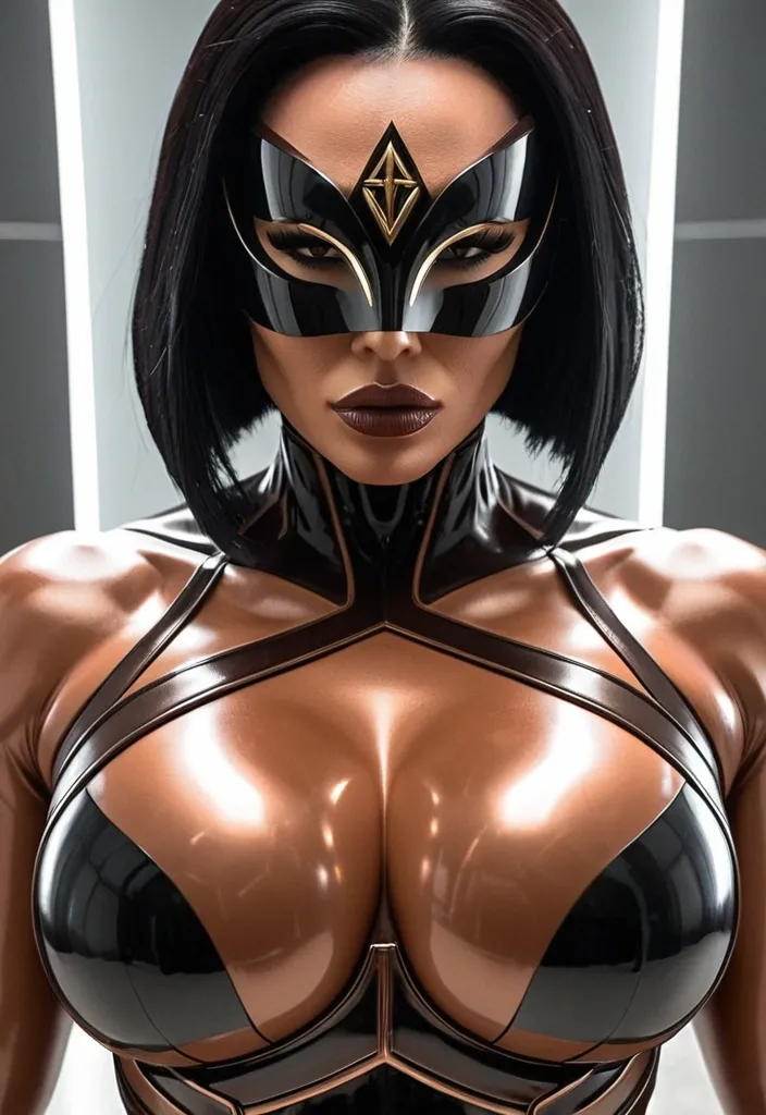 Generate Gorgeous female boss , bimbo , Japanese woman , hourglass body , abnormally massive female bodybuilder , gorgeous , close up , full lips , big booty , black hair , pompadour short bob-cut , , feminine silhouette , too big breast , big booty , sexy thighs abs , silhouette , up close , flexing biceps , beautiful brown eyes , legs are iconic and defining physical feature , both visually and in terms of combat ability.wearing an outfit that is a striking blend of elegance , power , and femininity , designed to command attention in any room. The suit is tailored to perfection , hugging the wearer’s curves with precision while emphasizing a structured silhouette. The fabric itself is a refined grey tweed patterned with subtle white grid lines , giving the suit a texture that feels both sophisticated and modern. The blazer features broad blue lapels and gold button accents , adding a luxurious touch that elevates the look beyond typical business attire. The matching high-waisted trousers elongate the frame , further enhancing the poised and commanding effect of the ensemble.The styling choices amplify the boldness of the suit. The inner blouse is a silky , greybutton-down shirt that complements the tweed’s tone while introducing a softer , feminine balance to the sharp tailoring of the jacket. The blouse peeks out neatly from under the blazer , maintaining elegance without drawing focus away from the suit’s commanding cut. Accessories are kept minimal yet intentional: a delicate layered gold necklace and hoop earrings that add glimmers of light and luxury without overpowering the outfit. The choice of voluminous , honey-brown braids cascading down her shoulders frames the face with both confidence and glamour , completing the commanding visual.Altogether , this look communicates a blend of authority and allure. It is business-ready yet fashion-forward , balancing corporate structure with vibrant femininity. The color palette blue , grey and gold avoids being overly delicate , instead embracing the richness of texture , structure , and presence. This is the kind of ensemble that speaks to ambition , sophistication , and personal style—ideal for someone who thrives in positions of influence but insists on expressing her individuality with bold elegance. It’s not just clothing—it’s a statement of power wrapped in grace. In luxury living legs that could crush a watermelon , skirt high boots are a bold and striking statement piece , crafted in glossy black patent leather that gives them a sleek , polished finish. Rising to just below the knee , the boots feature three adjustable buckle straps along the shaft , adding both edge and detail to their design. The towering stiletto heel , paired with a thick platform sole , creates an ultra-dramatic silhouette that elongates the leg and exudes power and confidence. With their combination of shine , height , and structure , these boots perfectly balance fierce femininity with high-fashion allure. Massive breast , massive cleavage , Up close shotThis powerhouse hourglass silhouetted female superhero wears a sleek , form-fitting brown-beige bodysuit with intricate dark bronze accents that highlight her powerful physique , complemented by a dramatic intense stare that adds mystery and flowing movement. A distinctive f her face while leaving her determined expression visible , and the prominent dark bronze hourglass emblem on her chest symbolizes vigilance , freedom , and unyielding strength. Massive cleavage , up close shot , mask with futuristic visors , full body shot ,
