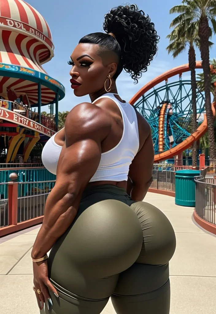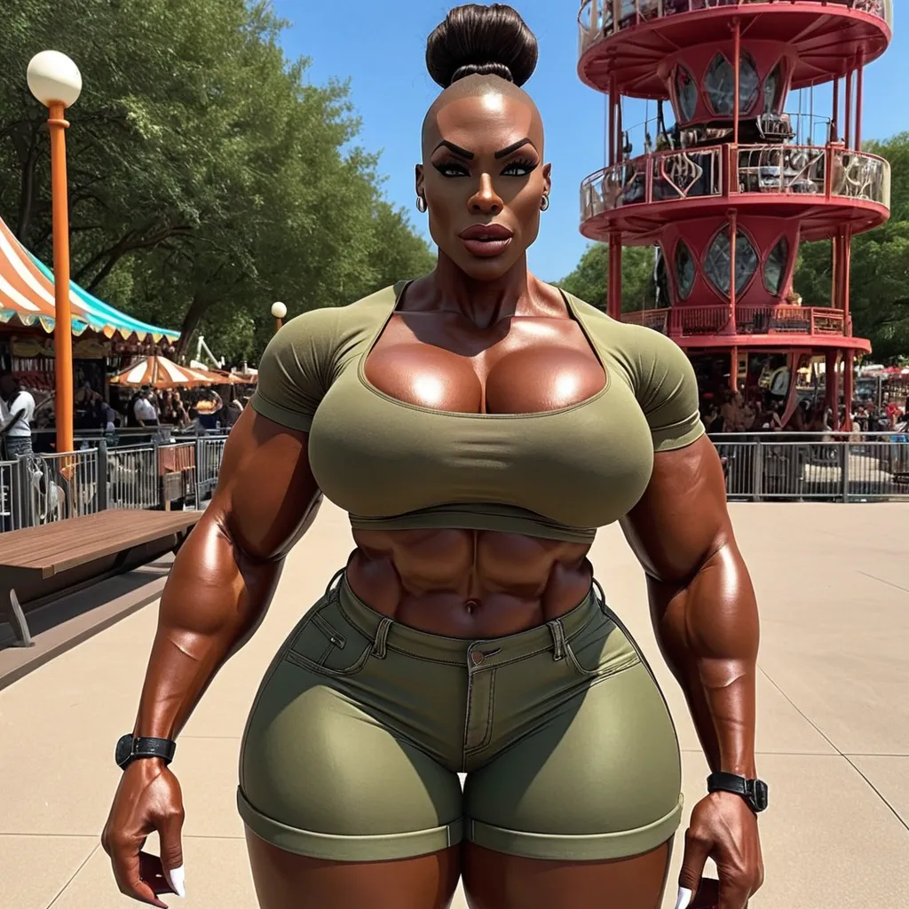 Dark skinned African American woman , female , hourglass body , abnormally massive female bodybuilder , gorgeous , close up , full lips , big booty , brown , on face and breast , Mohawk ponytail , bald shaved feminine silhouette , too big breast , big booty , sexy thighs abs , silhouette , up close , flexing biceps , beautiful green eyes , legs are iconic and defining physical feature , both visually and in terms of combat ability.wearing an outfit that is a striking blend of elegance , power , and femininity , designed to command attention in any room. The suit is tailored to perfection , hugging the wearer’s curves with precision while emphasizing a structured silhouette. The fabric itself is a refined grey tweed patterned with subtle white grid lines , giving the suit a texture that feels both sophisticated and modern. The blazer features broad blue lapels and gold button accents , adding a luxurious touch that elevates the look beyond typical business attire. The matching high-waisted trousers elongate the frame , further enhancing the poised and commanding effect of the ensemble.The styling choices amplify the boldness of the suit. The inner blouse is a silky , greybutton-down shirt that complements the tweed’s tone while introducing a softer , feminine balance to the sharp tailoring of the jacket. The blouse peeks out neatly from under the blazer , maintaining elegance without drawing focus away from the suit’s commanding cut. Accessories are kept minimal yet intentional: a delicate layered gold necklace and hoop earrings that add glimmers of light and luxury without overpowering the outfit. The choice of voluminous , honey-brown braids cascading down her shoulders frames the face with both confidence and glamour , completing the commanding visual.Altogether , this look communicates a blend of authority and allure. It is business-ready yet fashion-forward , balancing corporate structure with vibrant femininity. The color palette blue , grey and gold avoids being overly delicate , instead embracing the richness of texture , structure , and presence. This is the kind of ensemble that speaks to ambition , sophistication , and personal style—ideal for someone who thrives in positions of influence but insists on expressing her individuality with bold elegance. It’s not just clothing—it’s a statement of power wrapped in grace. In luxury living legs that could crush a watermelon , skirt high boots are a bold and striking statement piece , crafted in glossy black patent leather that gives them a sleek , polished finish. Rising to just below the knee , the boots feature three adjustable buckle straps along the shaft , adding both edge and detail to their design. The towering stiletto heel , paired with a thick platform sole , creates an ultra-dramatic silhouette that elongates the leg and exudes power and confidence. With their combination of shine , height , and structure , these boots perfectly balance fierce femininity with high-fashion allure. High cheekbones , prominent jawline , gorgeous big light reflecting hazel eyes , enormous breast , cartoon bunny on brown t-shirt- , green cargo pants shorts , denim walking in amusement park , enormous butt , ebbreast , thunder thighs and hips ,