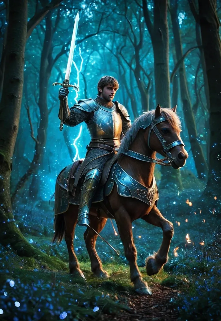 A knight without a helmet rides a large brown tabby tomcat and holds up his magical sword surrounded by blue magical sparks in a mystical , enchanted fantasy forest Modifiers: fantasy oil on canvas 4k high detail wallpaper award winning hdr Knight Chivalry More about The Heroic Knight in an Enchanted Forest A true and heroic knight on his loyal warhorse rides through an enchanted forest , wielding a powerful magical sword to destroy all evil. #chevalier #chivalrous #chivalry #enchanted #fantasy #forest #hero #heroic #historic #history #horse #knight #knighthood #knightsoath #lambs #lightning #magicsword #oath #philosophy #sparkle #steed #sword #trueknight #virtues #virtuous #warhorse #warsteed #woods #ydl ,