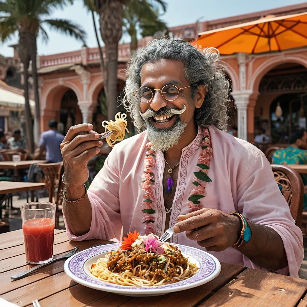 Photorealistic cinematic image of a joyful indian man (use uploaded photo don't alter the face or appearance) in his 50s with long curly white mustache , wearing a Rajasthani traditional light-pink kurta , traditional white dhoti with delicate framed glasses (same or very similar styling to input image) , laughing heartily while twirling spaghetti with a fork at an outdoor restaurant table on a sunny day. Next to him sits a highly detailed Xenomorph alien with scaly greenish-brown skin , a feathered crest on its head , sharp teeth , wearing a matching Goanessshirt with red and orange hibiscus flowers , also eating spaghetti with clawed hands and rings on its fingers. In the background , a muscular blue-skinned alien with intricate white and purple tribal tattoos and patterns serves food on a plate. The setting is a bright Mediterranean-style outdoor cafe with coconut trees , stucco buildings , other diners , wooden table with plates of spaghetti bolognese , bread , glasses of water , and a wine bottle. Natural daylight , sharp details , high resolution , vibrantcolors , fun and whimsical atmosphere. ,