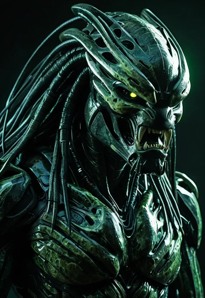 Capture a striking , high-resolution photograph of an anthropomorphic Predator , exuding an aura of mystery and intrigue. The Predator's skin is adorned with intricate , light-green circuit patterns that seem to pulse with an otherworldly energy. Dynamic light interference effects ripple across its skin , creating a mesmerizing interplay of light and shadow that accentuates its features and adds a sense of movement to the still image. The Predator's black hair is sleek and well-groomed , cascading down its back and framing its face in a way that draws the viewer's attention to its enigmatic features. Its top is facing the camera , allowing for a clear and detailed view of its face and upper body. The Predator's eyes are narrow and piercing , reflecting a hint of the unknown and adding to the overall sense of intrigue. The background is a deep , dark void , providing a stark contrast that makes the Predator stand out prominently. The lighting is carefully crafted to create subtle shadows that accentuate the Predator's features , highlighting the contours of its face and the intricate details of its circuit-patterned skin. The lighting also casts a soft glow on the Predator , giving it an ethereal quality that enhances its otherworldly appearance. This shot is captured in the style of an Arriflex 35 BL camera , known for its ability to capture high-contrast , high-detail images. The Canon K35 prime lenses are used to achieve a sharp , clear image with a slight vintage feel , adding a touch of nostalgia to the futuristic subject. The overall composition is balanced and symmetrical , drawing the viewer's eye directly to the Predator and holding their attention. The image conveys a sense of anticipation and curiosity , inviting the viewer to wonder about the Predator's origins , its purpose , and the story behind its existence. The high resolution and detailed rendering of the image ensure that every aspect of the Predator's appearance is captured with precision and clarity , making it a truly captivating and intriguing photograph. ,