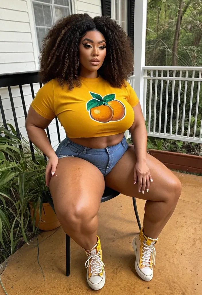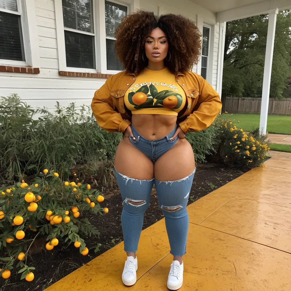 Very light skin African-American woman with Fons , her face and torso and oranges beautiful freckles light , stacked , powerful hourglass silhouette brown , abs , muscular legs and thighs , hazel , honey big eyes , big four clump lips , curly Afro hair , big round enormous breast , beautiful freckles on breast , small ways , thunder , thighs and hips enormous butt cute face 24 years old wearing a wait yellow and brown accident floor , floral t-shirt , black denim , jacket and black denim pants sitting on porch and backyard ,