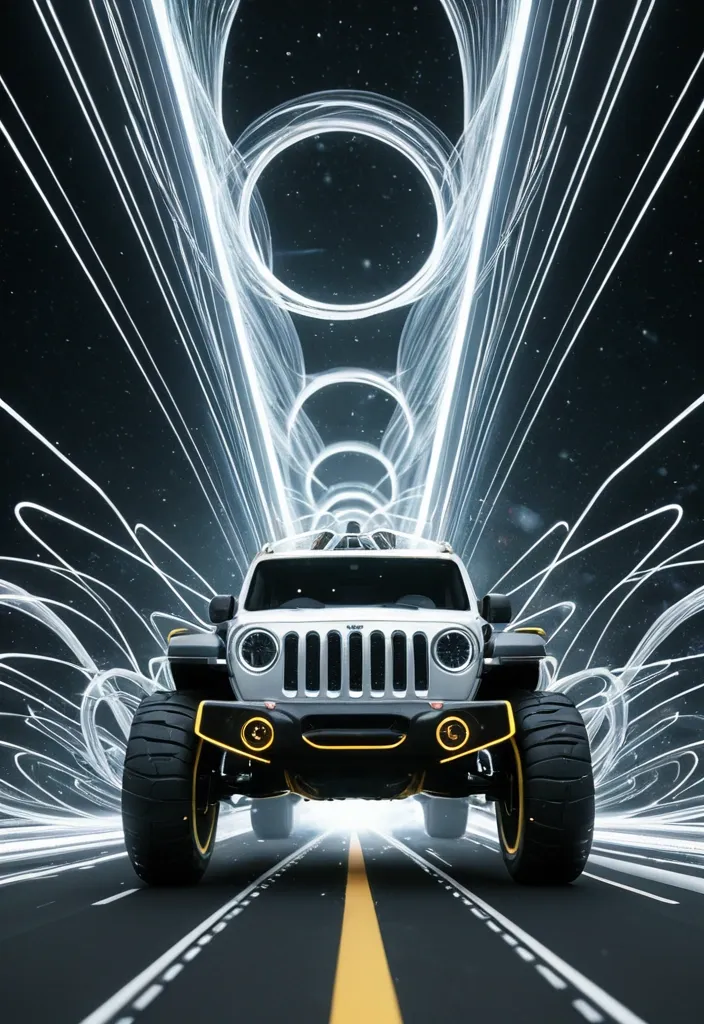 A full-body image of a open-jeep , designed by Dr. Suess an interlocking crab-body. The main body is finished in smooth black with yellow filigree patterns that trace along the edges of moving wheels. Each segment of the car’s structure carries an embedded weapon core housed beneath mirror-fold armor plates that open in layered sections. The nose is structured into a flat , sloped array with a hidden directional array sandwiched between angular crystal lens shields. gracefully navigating through a swirling vortex of Horizontally bridge-road. Style: Celestial , ethereal , abstract , digital art smoking: Dramatic backlighting , bright glowing particles , contrasting dark background Composition: dynamic diagonal composition , upward gaze Details: Sparkling white waves and smoke , streaking white light trails , sense of movement and wonder , magical atmosphere Quality: High detail , 4K , Masterpiece , Rendered in Octane ,