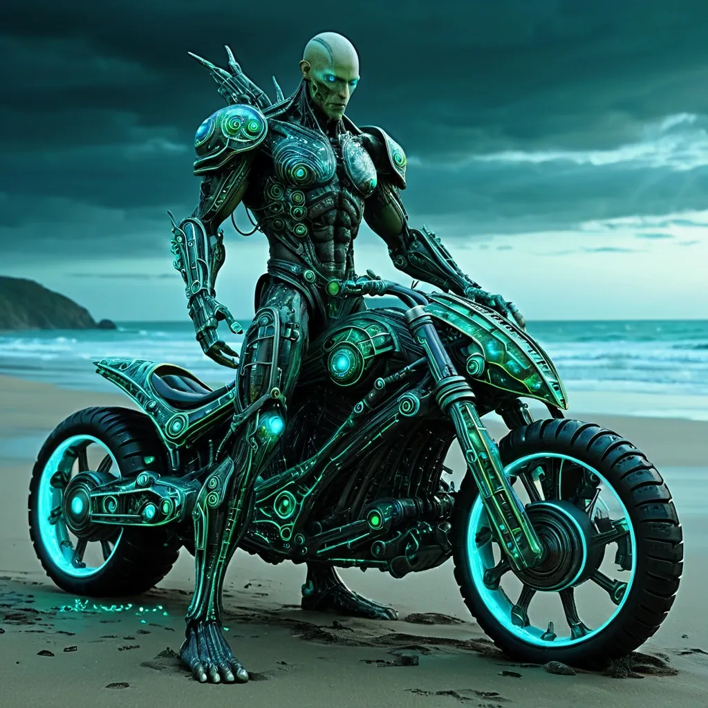 Bird eye long-distance view , Fantasy characters , techno organic , cybernetic , Electronic circuit pattern and wires , bone and metal grim dark , cybernetic muscular male Na'vi rider , a futuristic concept motorcycle with a green shell covering the entire body and blue glow , with wide horizontal square wheels and body , at landscape of beach , in the style of HR Giger , ,