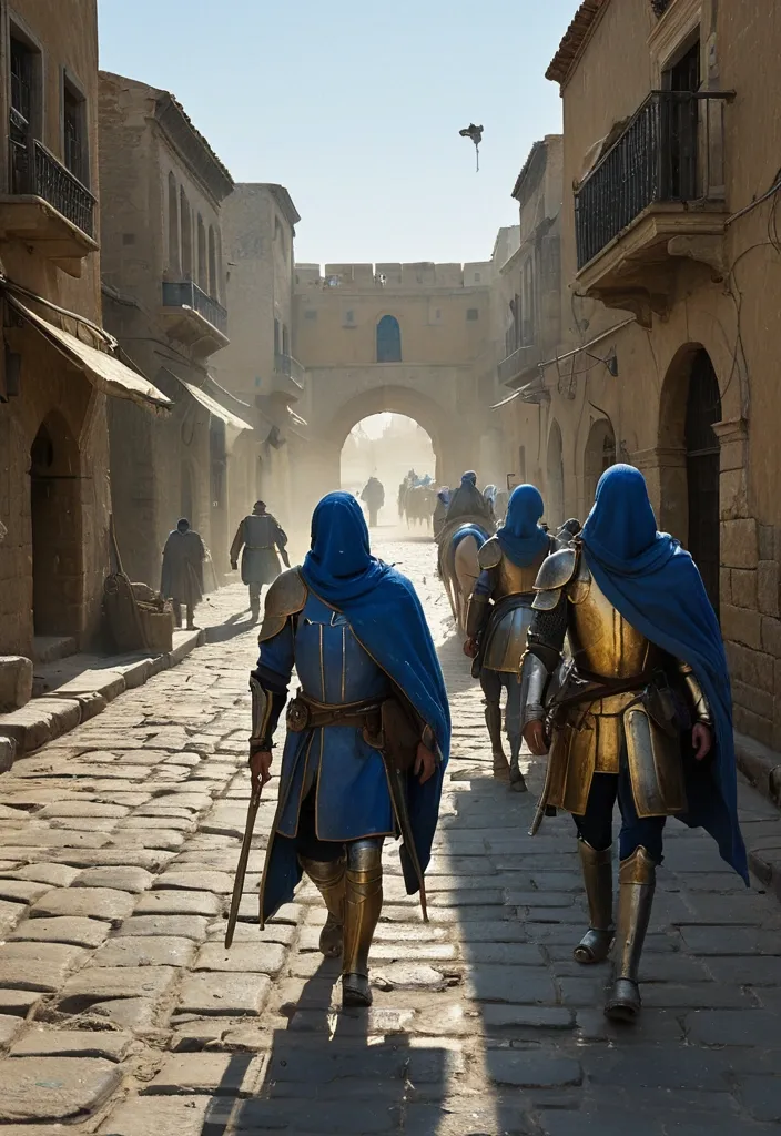 Scene: Crossing the Blue Zone [Exterior – The Outskirts of the Blue Zone , Midday] The sun hangs high , painting the cobbled road in gold and dust. Merchants shout across the square , guards in blue-and-silver armor stand at the gates , and the air hums with the scent of baked bread and horse sweat. Bob and Silk walk side by side , cloaked in travel dust — their eyes sunken , their steps heavy from a sleepless night of walking. ,