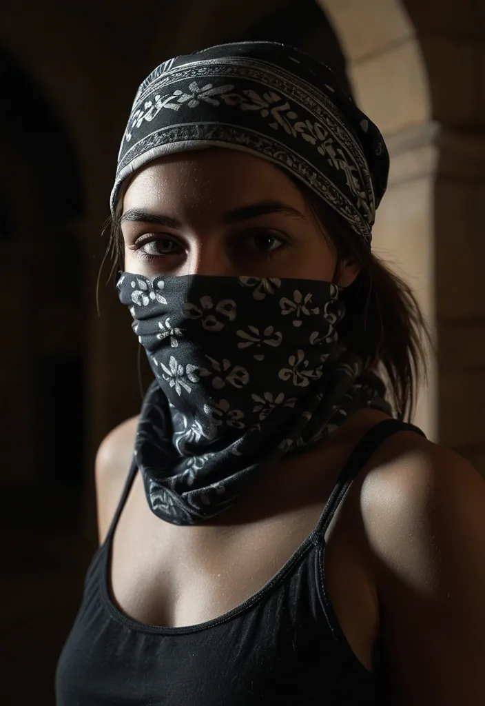 Her eyes are large , almond-shaped , and a striking icy blue-gray , heavily emphasized with long lashes and a piercing gaze that looks directly at the viewer. The sclera is bright white , the irises detailed with radial patterns and tiny highlights , giving them an almost luminous quality. There is a slight upward tilt at the outer corners , enhancing commanding expression. The eyebrows are thick , perfectly arched , and darker than the hair , framing the eyes dramatically.Her body is the most exaggerated aspect of the image , built to extreme proportions that combine hyper-muscularity with hyper-feminine curves. Shoulders are broad and powerfully capped , arms thick with vascular , sculpted muscle , and abs are deeply etched in an almost anatomical level of definition. Yet the waist remains improbably narrow before flaring into extremely wide hips and massive , rounded glutes. The bust is enormously enlarged far beyond natural human proportions , defying both gravity and realism , with the white wrap struggling to contain it. Every muscle is highlighted with glossy oil-like shine , emphasizing separation and size; the overall physique is a fantasy hybrid of competitive female bodybuilder and exaggerated hourglass pin-up. Full body shot , Black t-shirt. Black pants ,
