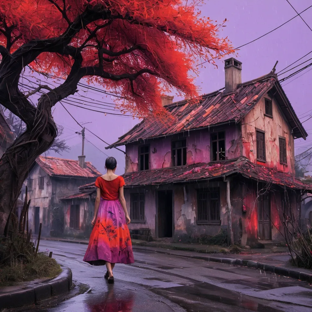A surrealist depiction of a quaint , aged house , central in the image , its architecture characterized by peeling paint , a distressed roof , and a chimney , blending with the branches of a vibrant , fiery-red tree that appears to engulf it. A beautiful woman appearing to be wearing a dress created from blooming flowers and a fluorescent lavender dress walks in the foreground , carrying a bamboo basket , its presence adding a sense of solitude against an abstract. The background gradient transitions from a warm , old village street , providing a stark contrast to the house. The house's texture displays a weathered aesthetic , with the effect of water dripping. The entire scene evokes an atmosphere of melancholy and introspection. ,
