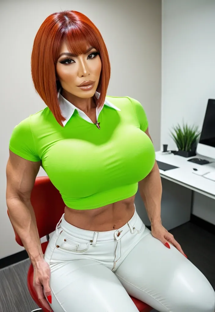 Generate Gorgeous female boss , bimbo , Japanese woman , , hourglass body , abnormally massive female bodybuilder , gorgeous , close up , full lips , big booty , red hair , bob-cut , short hair , feminine silhouette , too big breast , big booty , sexy thighs abs , silhouette , up close , flexing biceps , beautiful brown eyes , legs are iconic and defining physical feature , both visually and in terms of combat ability.wearing an outfit that is a striking blend of elegance , power , and femininity , designed to command attention in any room. The suit is tailored to perfection , hugging the wearer’s curves with precision while emphasizing a structured silhouette. The fabric itself is a refined grey tweed patterned with subtle white grid lines , giving the suit a texture that feels both sophisticated and modern. The blazer features broad blue lapels and gold button accents , adding a luxurious touch that elevates the look beyond typical business attire. The matching high-waisted trousers elongate the frame , further enhancing the poised and commanding effect of the ensemble.The styling choices amplify the boldness of the suit. The inner blouse is a silky , greybutton-down shirt that complements the tweed’s tone while introducing a softer , feminine balance to the sharp tailoring of the jacket. The blouse peeks out neatly from under the blazer , maintaining elegance without drawing focus away from the suit’s commanding cut. Accessories are kept minimal yet intentional: a delicate layered gold necklace and hoop earrings that add glimmers of light and luxury without overpowering the outfit. The choice of voluminous , honey-brown braids cascading down her shoulders frames the face with both confidence and glamour , completing the commanding visual.Altogether , this look communicates a blend of authority and allure. It is business-ready yet fashion-forward , balancing corporate structure with vibrant femininity. The color palette blue , grey and gold avoids being overly delicate , instead embracing the richness of texture , structure , and presence. This is the kind of ensemble that speaks to ambition , sophistication , and personal style—ideal for someone who thrives in positions of influence but insists on expressing her individuality with bold elegance. It’s not just clothing—it’s a statement of power wrapped in grace. In luxury living legs that could crush a watermelon , skirt high boots are a bold and striking statement piece , crafted in glossy black patent leather that gives them a sleek , polished finish. Rising to just below the knee , the boots feature three adjustable buckle straps along the shaft , adding both edge and detail to their design. The towering stiletto heel , paired with a thick platform sole , creates an ultra-dramatic silhouette that elongates the leg and exudes power and confidence. With their combination of shine , height , and structure , these boots perfectly balance fierce femininity with high-fashion allure. High cheekbones , prominent jawline , gorgeous big brown eyes , enormous breast , lime green v cut t-ahirt , with white accented collar , denim jeans sitting down on stool in patient office ,